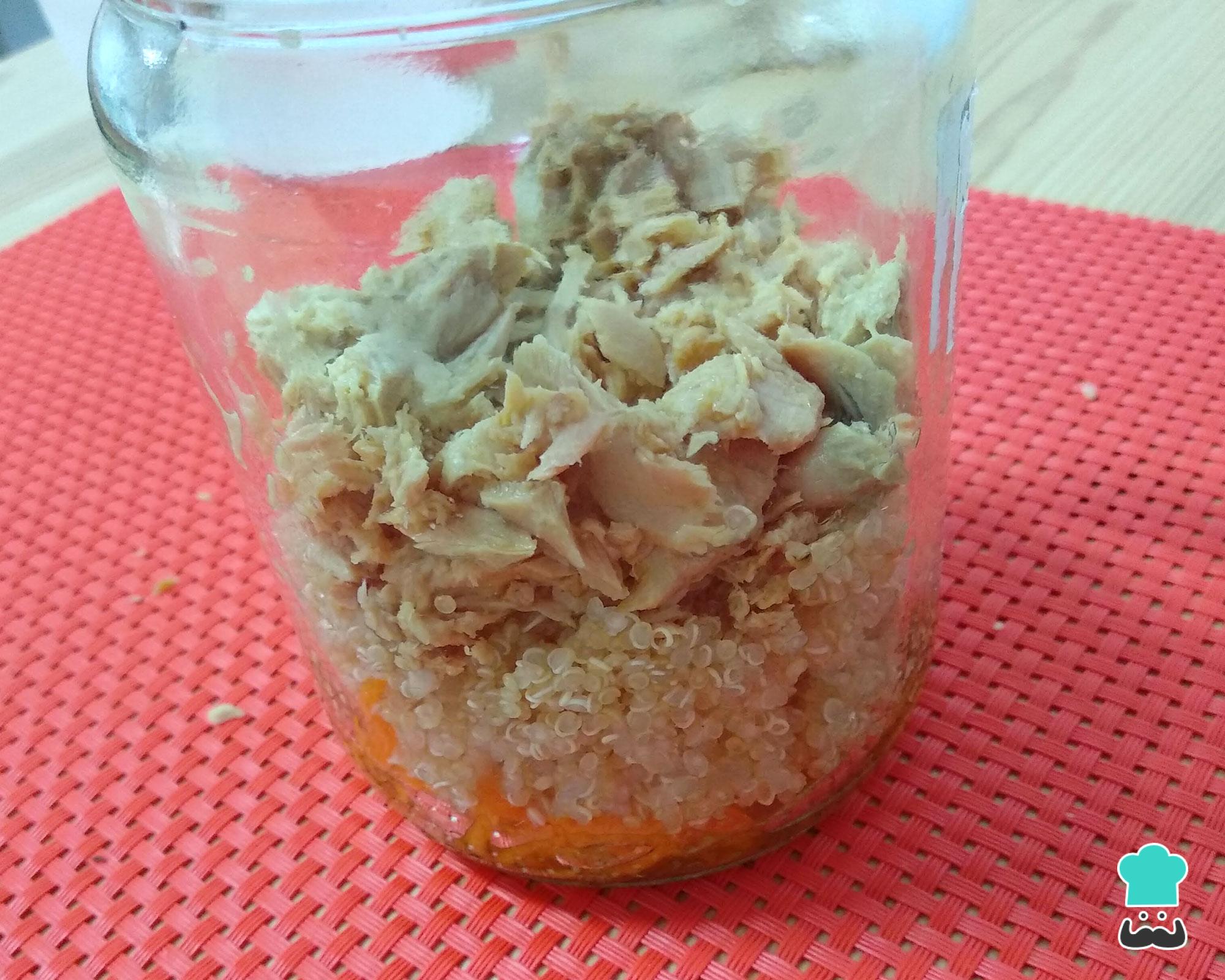 Em seguida acrescente a quinoa e o atum escorrido, sem misturar. É importante montar a salada no pote mantendo os ingredientes mais secos no topo, para prolongar a frescura deles durante o armazenamento.