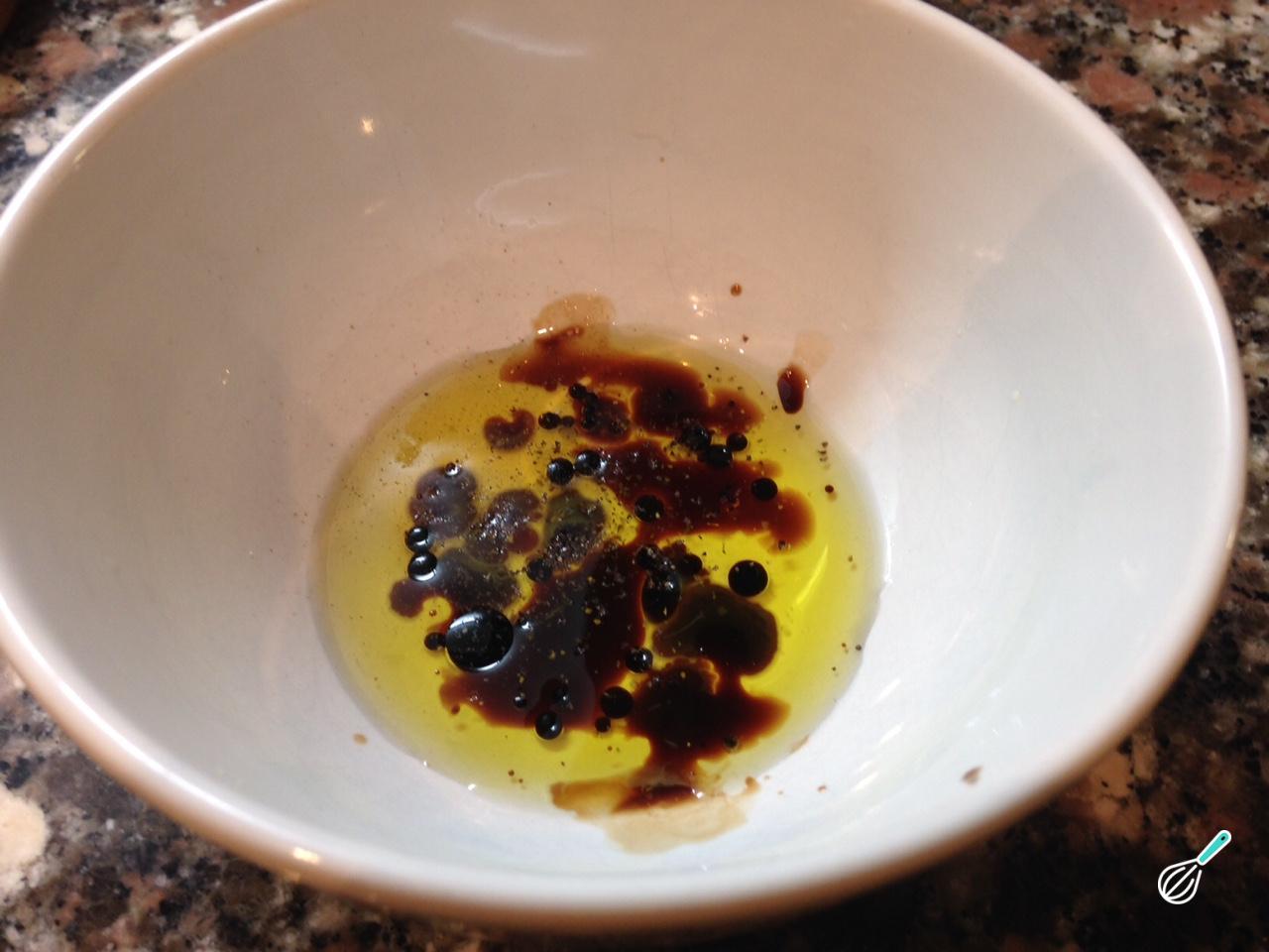 Comece por preparar o molho. Em uma tigela despeje um fio de azeite virgem, um de vinagre balsâmico e sal e pimenta do reino. Misture bem.