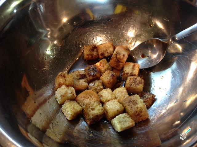 De seguida, despeje o tempero sobre os Croutons e deixe repousar durante 15 minutos. Desta forma o pão vai ficar bem ensopado.