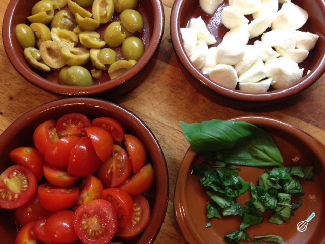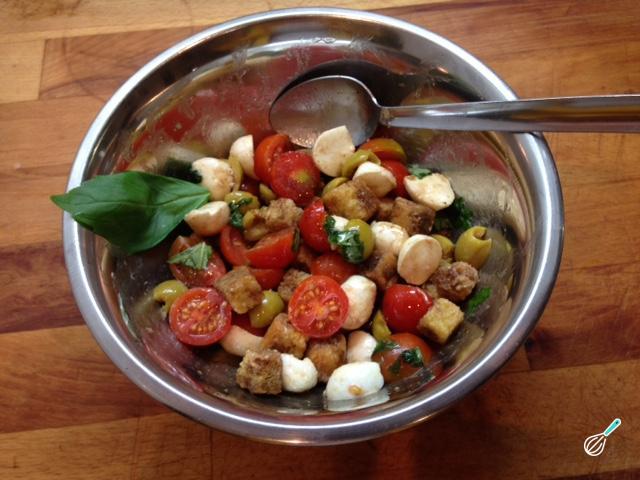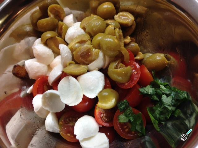 Agora corte o resto dos ingredientes da salada Panzanella. Corte os tomates em duas ou três partes, corte as azeitonas verdes ao meio, pique o manjericão e corte a mussarela em pedaços pequenos.