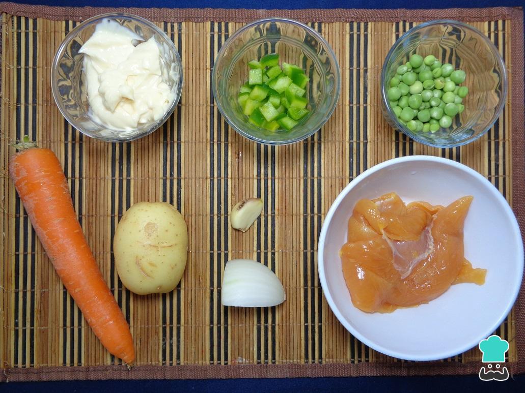 Comece por juntar todos os ingredientes necessários para poder preparar esta receita de salada russa com frango.