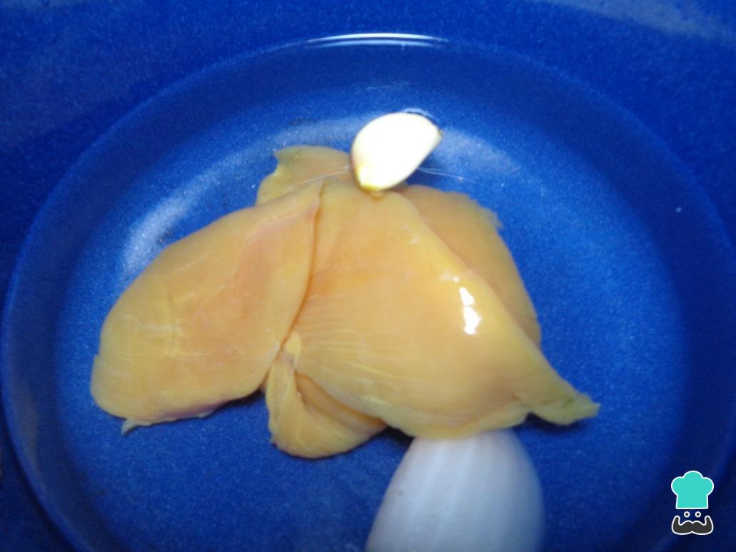 Em uma panela coloque o peito de frango previamente lavado, adicione um pouco de sal, cebola, alho e deixe que ferva durante 25 minutos ou até que o frango esteja perfeitamente cozido. Uma vez pronto, deixe esfriar e desfie o frango em pedaços pequenos.