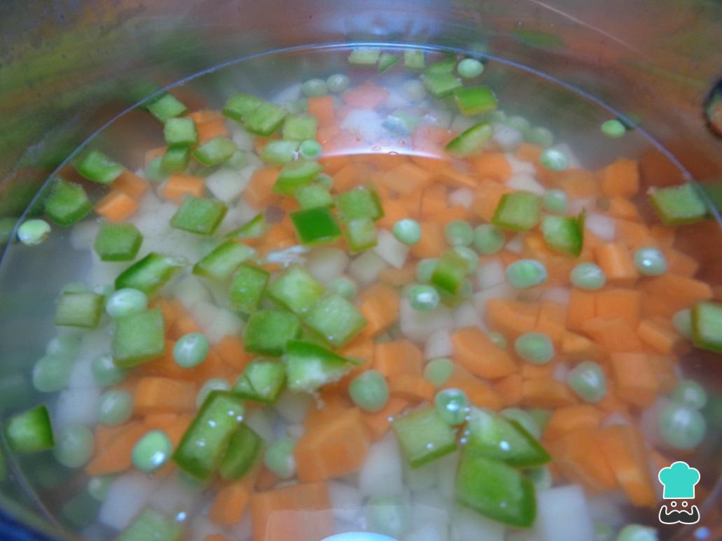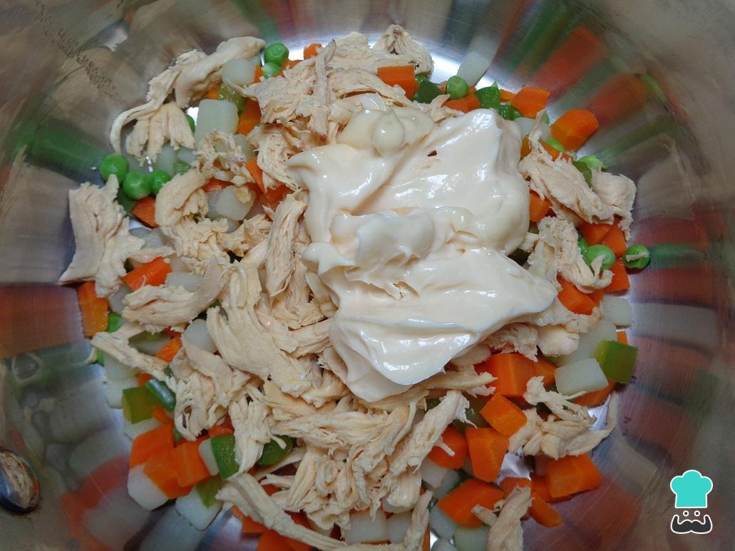 Uma vez cozinhadas as verdura, coloque em um recipiente e adicione o peito de frango desfiado e a pouco e pouco adicione a maionese, até obter uma consistência adequada.