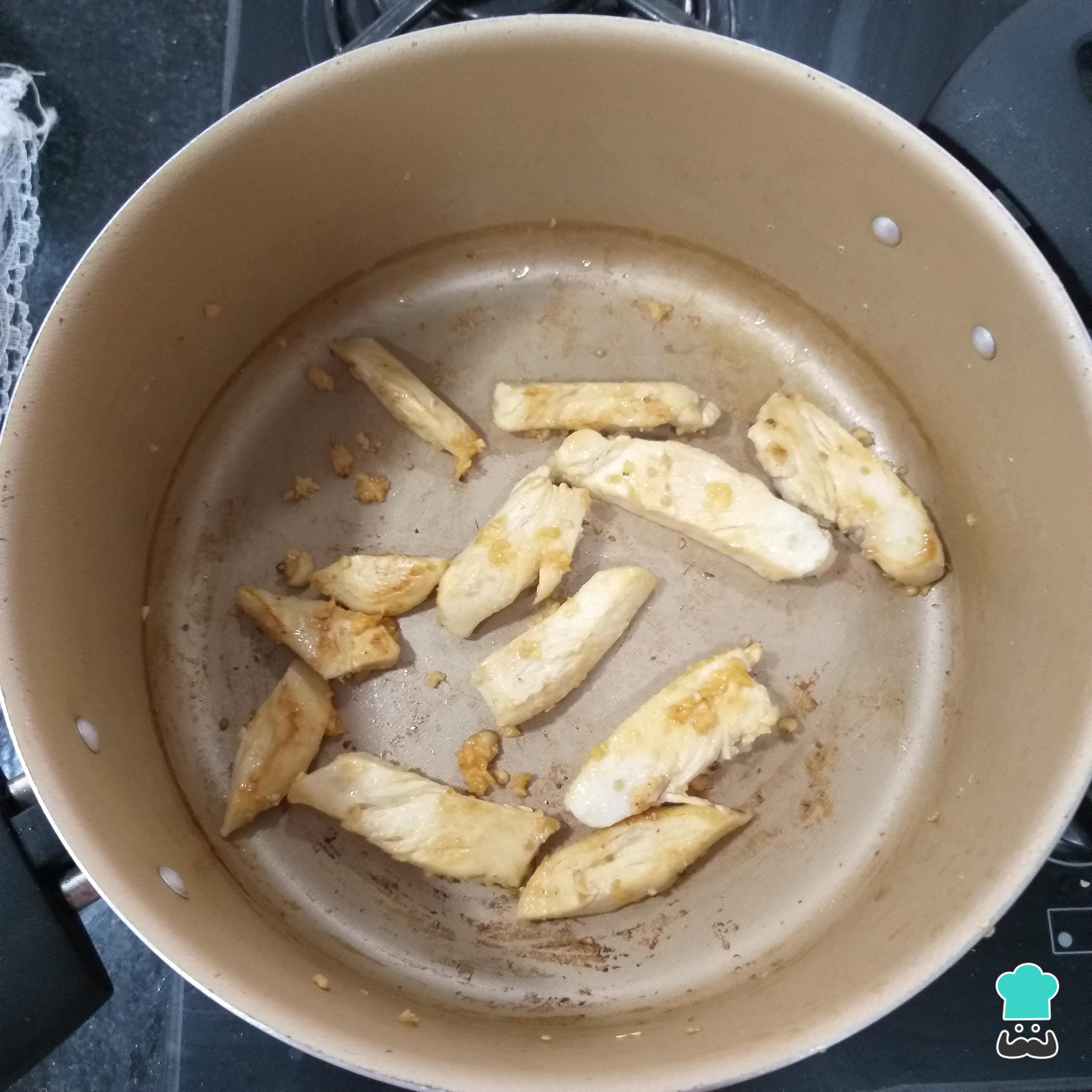 Leve uma frigideira ao fogo médio e acrescente um fio de azeite, o frango e o alho. Deixe no fogo até o frango dourar bem.