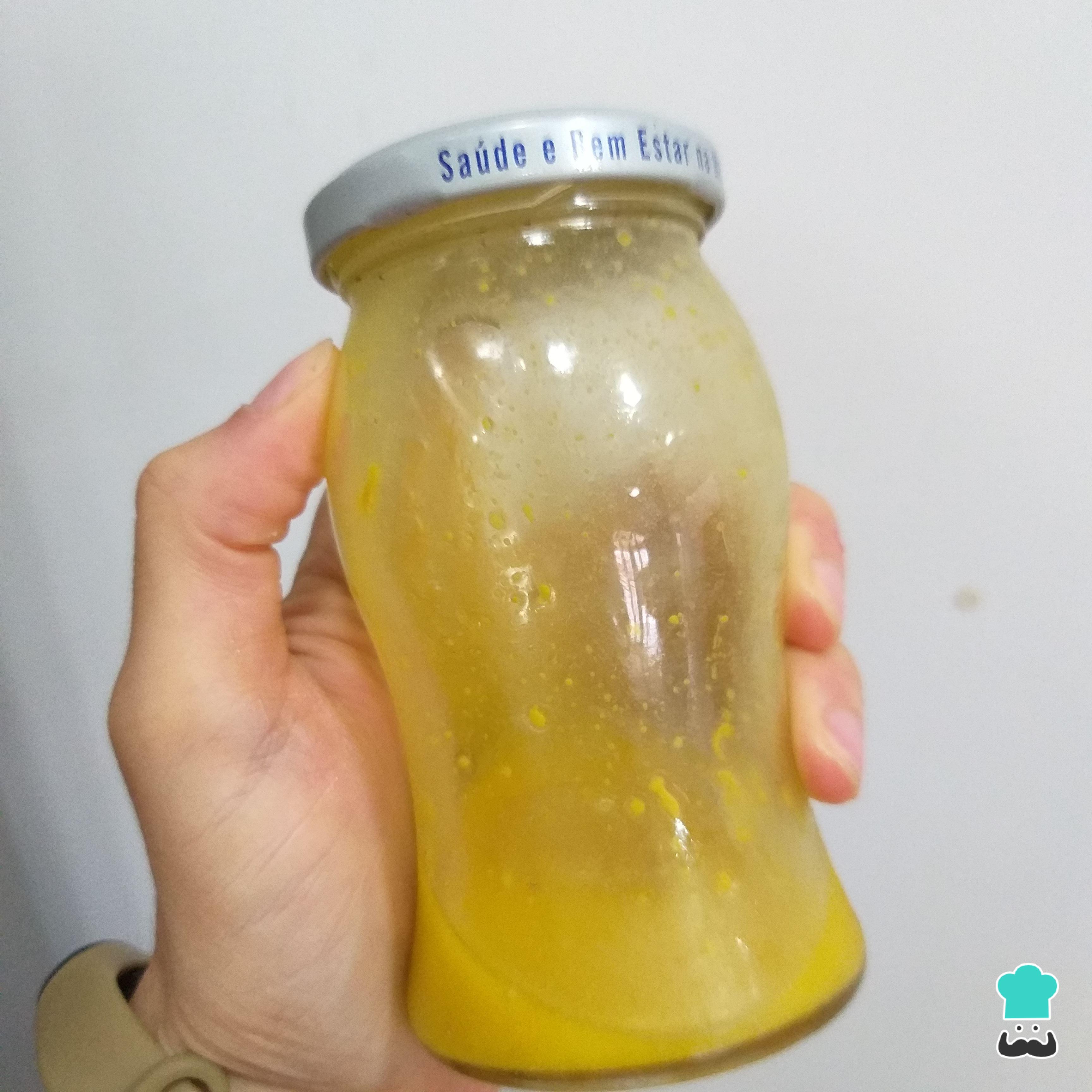 Em um pote de vidro coloque o suco de limão, a mostarda, o mel, o azeite e o sal. Tampe e chacoalhe até misturar bem. Reserve.