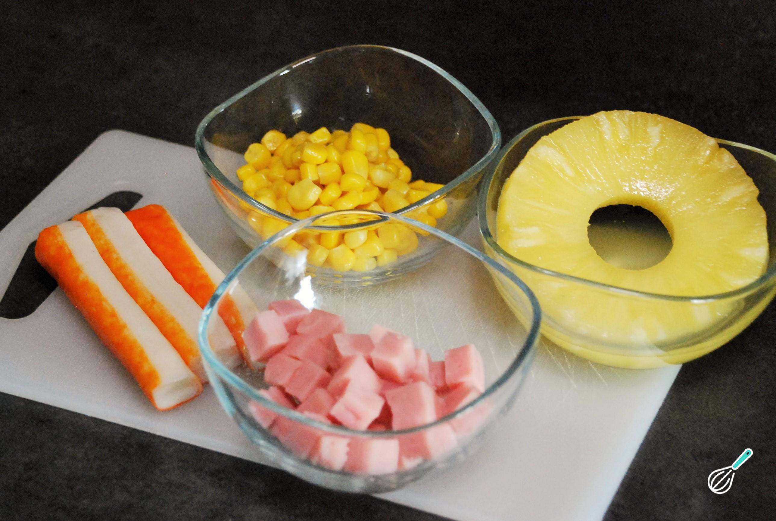 Para preparar esta salada tropical refrescante, a primeira coisa a fazer é reunir todos os ingredientes. Eu usei abacaxi enlatado usei o seu suco como parte dos ingredientes. Se você tem abacaxi natural, o resultado será muito melhor.