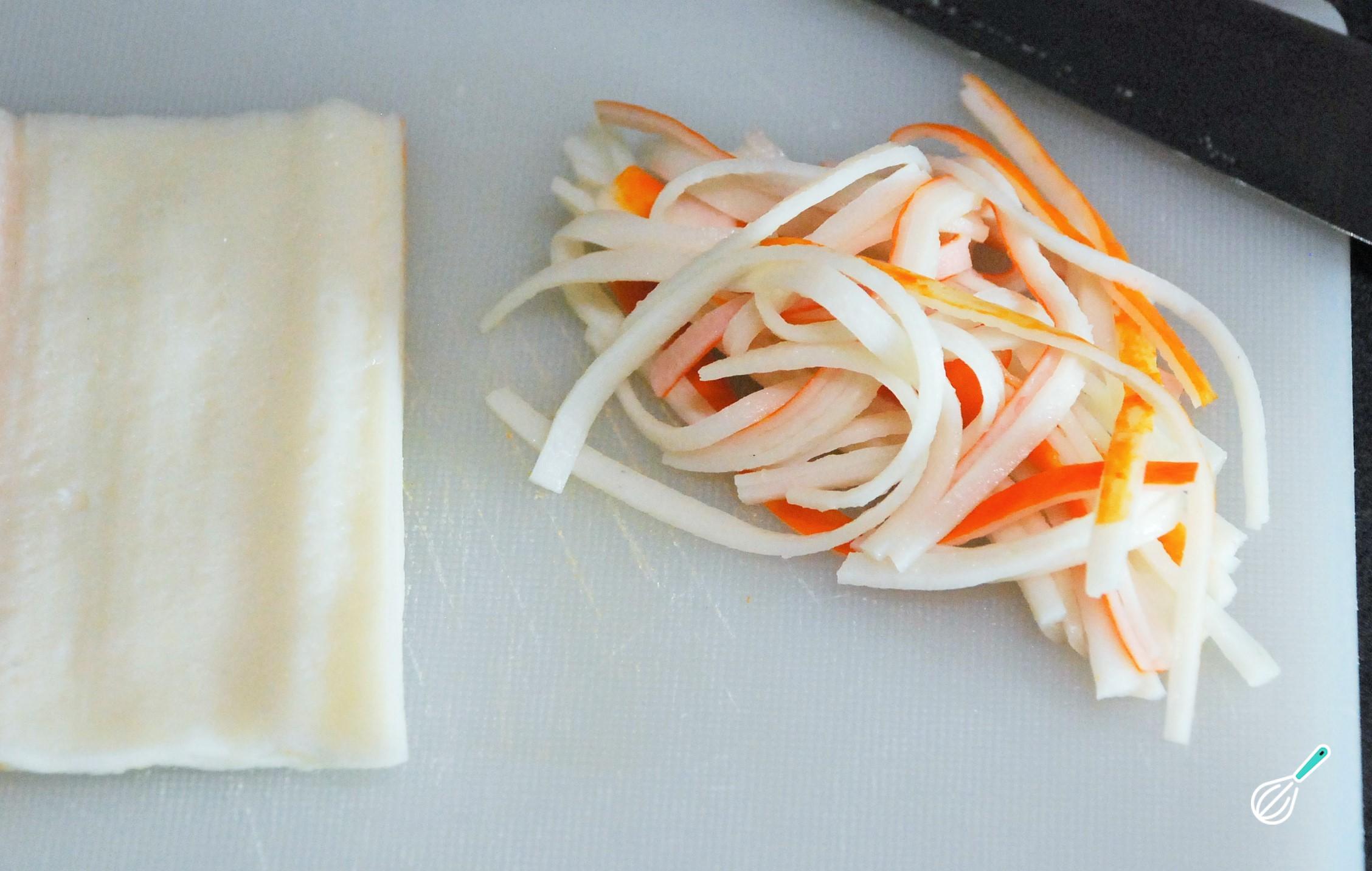 Corte as barras de caranguejo-os em tiras finas. Para fazê-lo, estenda as barras e corte na vertical, como é observado na foto.
