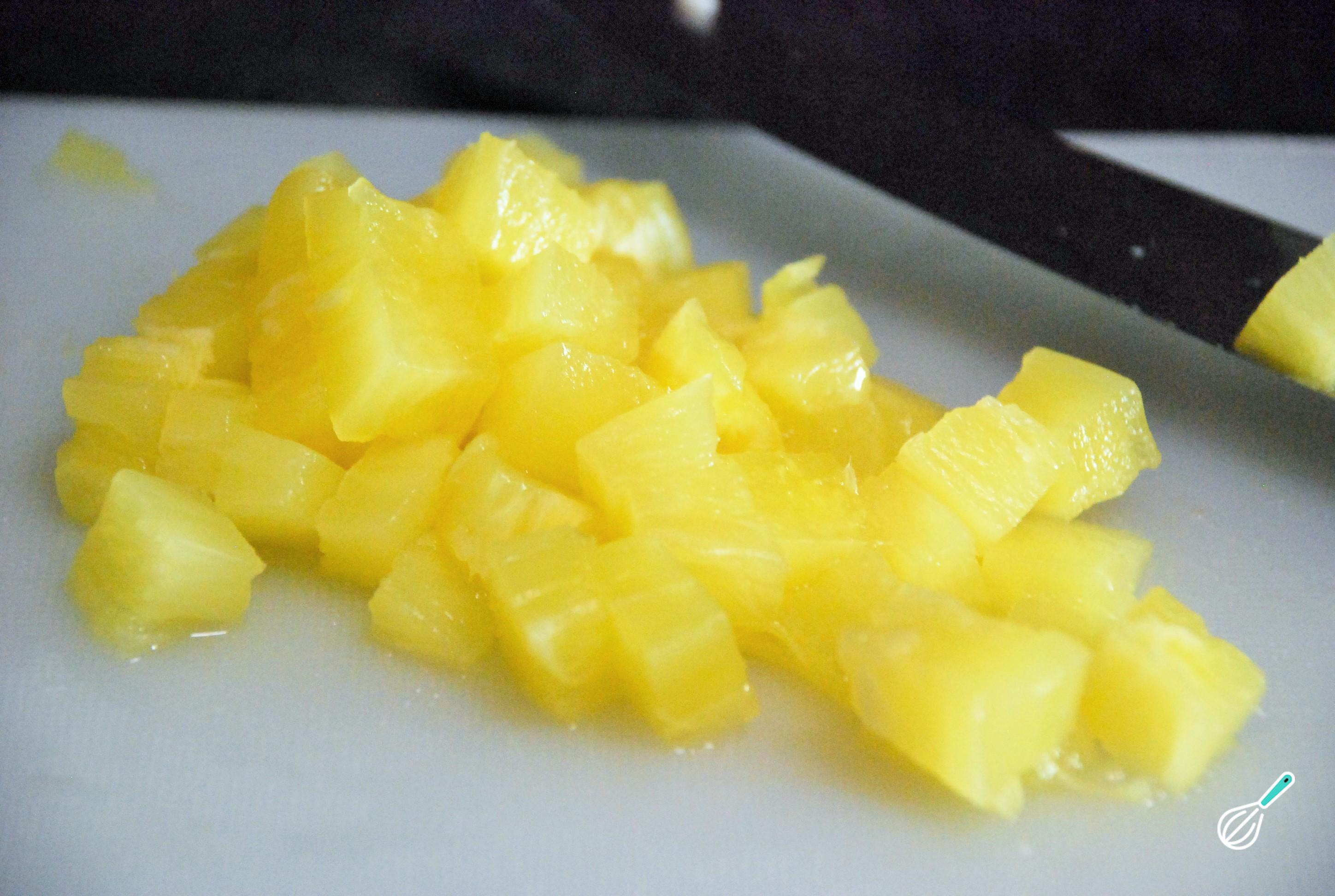 Corte a rodela de abacaxi em cubos pequenos. Se você usar o abacaxi natural, lembre-se de descartar o coração do fruto, que é o círculo central mais escuro e amargo.