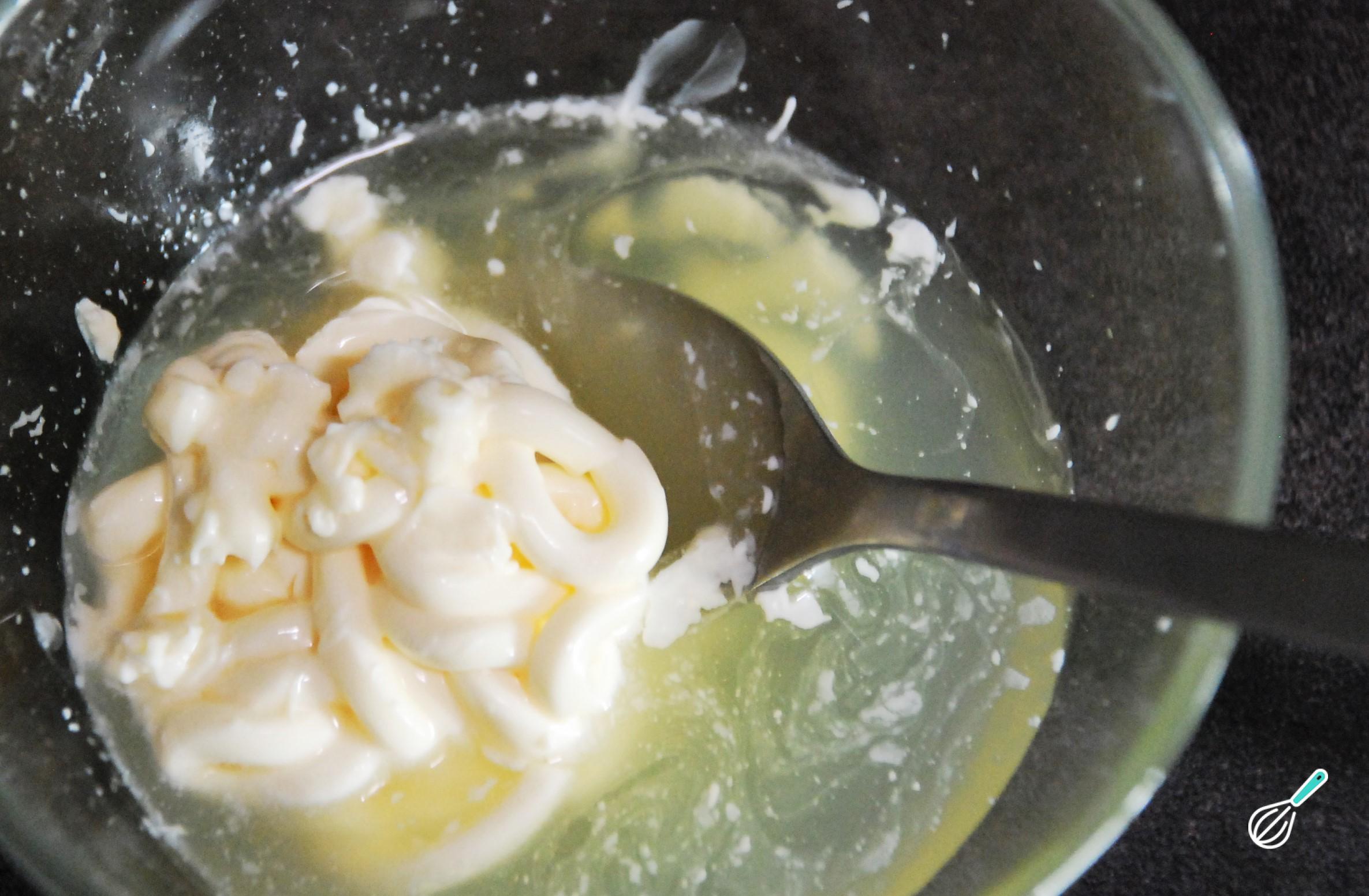 Misture a maionese com o suco do abacaxi. O resultado deve ser uma maionese ligeiramente mais líquida e com um tom mais amarelo. O segredo de uma boa salada tropical é essa mistura com suco de abacaxi.