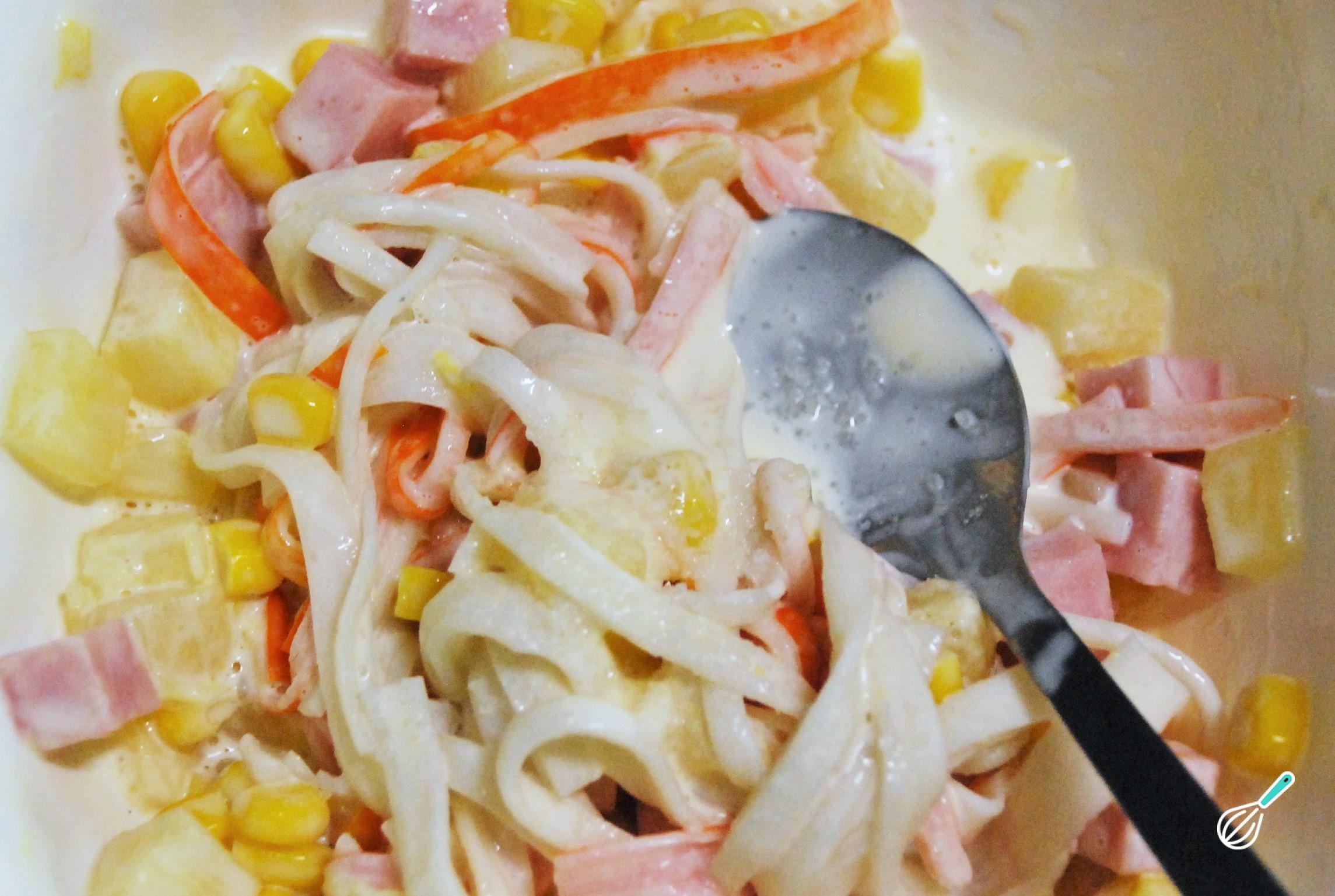 Coloque tudo em uma tigela e mexa bem para distribuir os ingredientes uniformemente. A maionese deve cobrir toda preparação completamente.