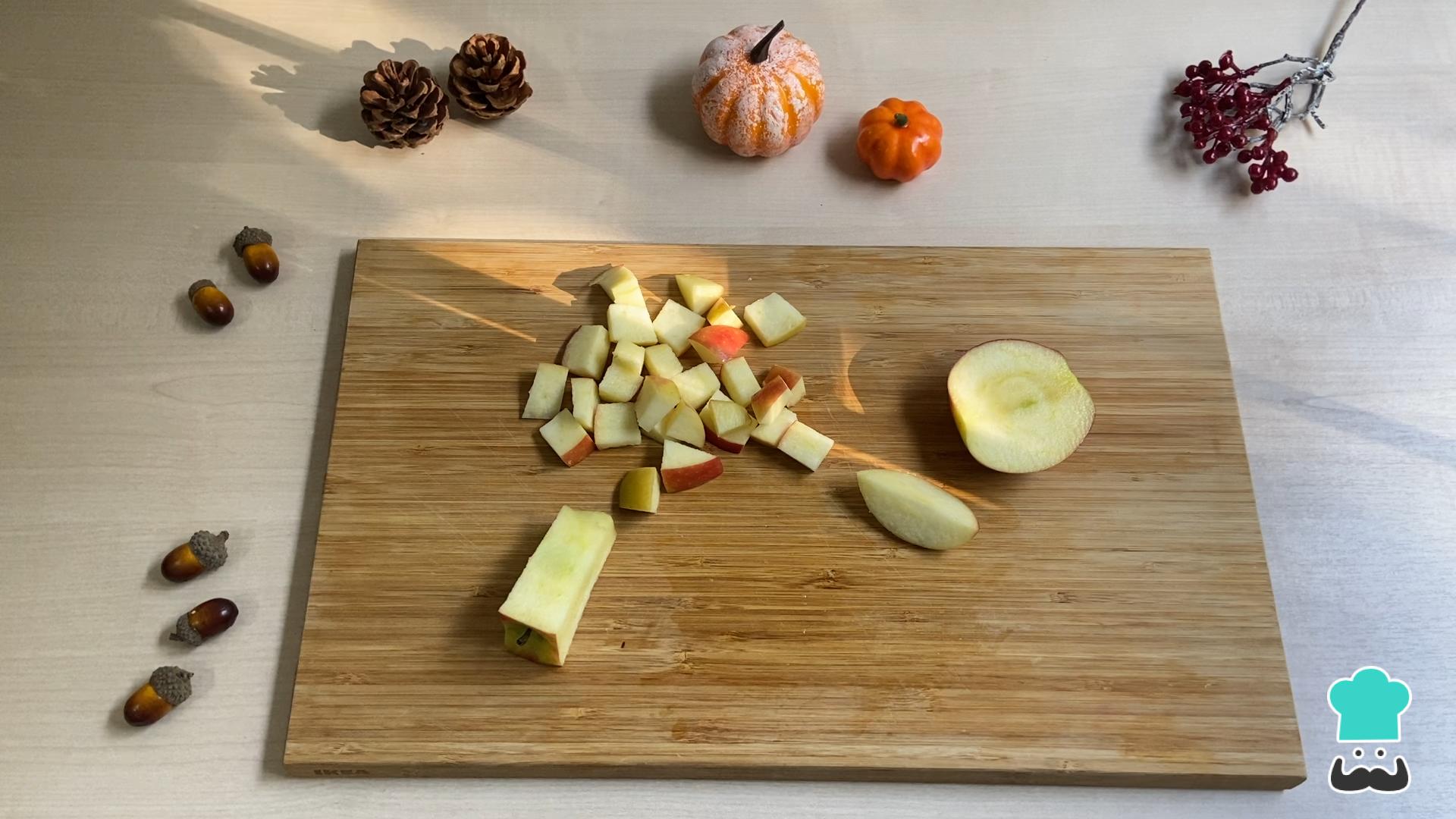 Pegue nas maçãs bem lavadas e corte-as em cubinhos. Adicione 1 colher de sopa de suco de limão para evitar que escureçam. Reserve e, em seguida, pegue as nozes e pique-as em pedacinhos.