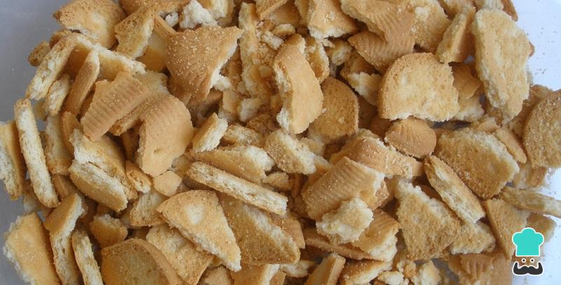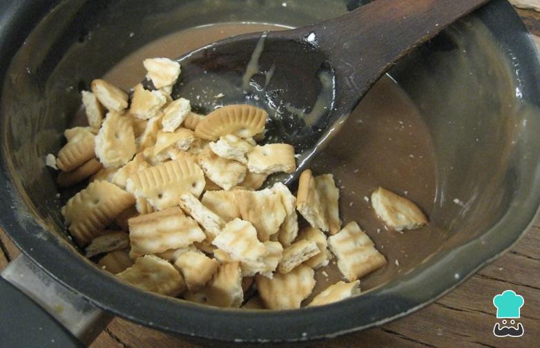 O primeiro passo da receita de salaminho de chocolate consiste em picar os biscoitos maizena grosseiramente. Você pode fazer isso à mão, na liquidificadora ou colocando os biscoitos em um saco e batendo-lhes com o rolo da massa.