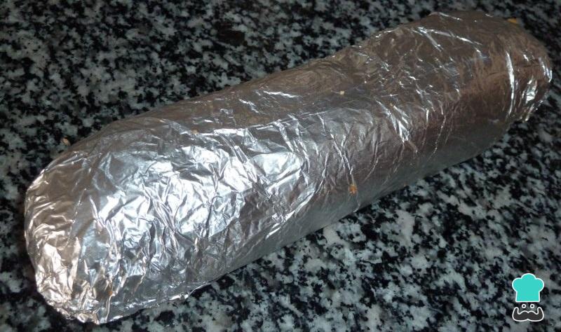 O resultado deverá ser uma pasta mais ou menos consistente. Estenda um papel alumínio e, sobre ele, disponha a massa de salaminho de chocolate em formato de cilindro. Embrulhe com o papel alumínio.