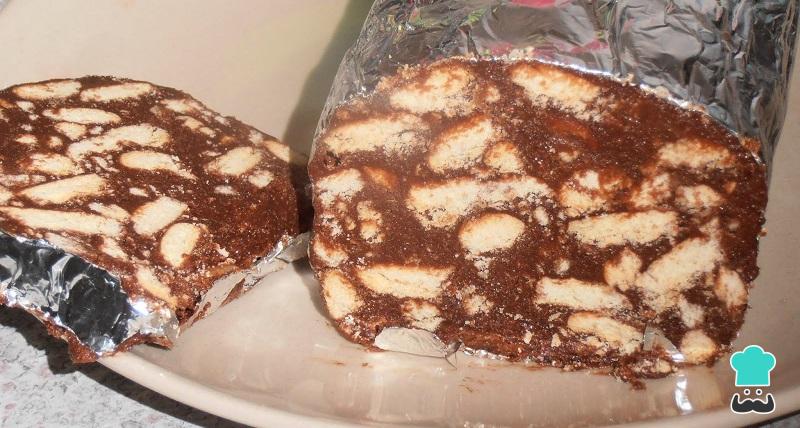 Coloque o salaminho de chocolate na geladeira, no mínimo 3 horas, para ganhar consistência. Retire, corte fatias grossas e sirva. Bom apetite!