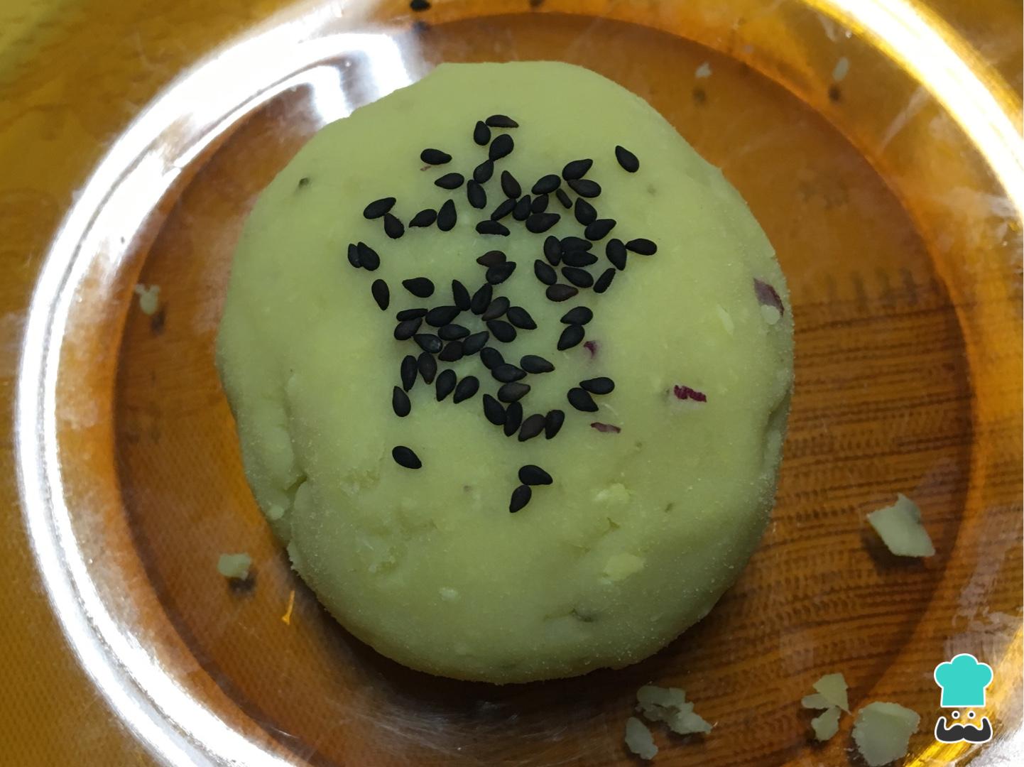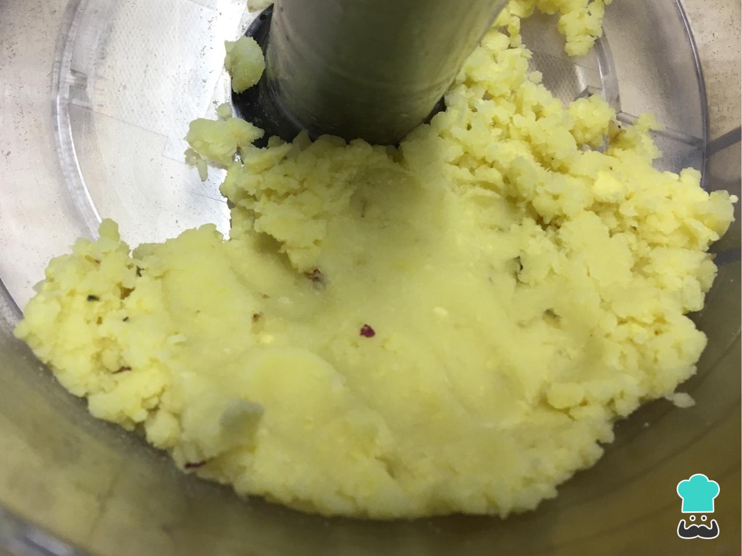 Retire, deixe a batata esfriar e descasque. Para preparar esta receita de salgado maromba low carb bata a batata no processador até virar uma massa e tempere com uma pitada de sal.