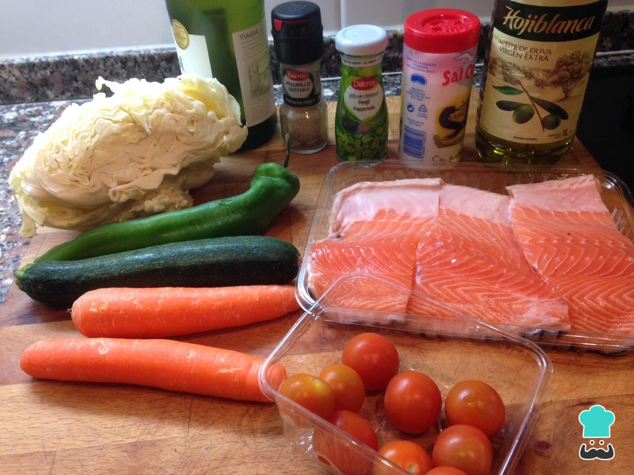 Aqui temos os ingredientes para esta receita de salão ao forno com legumes. Na peixaria cortaram o salmão em filetes e removeram a espinha. Quanto aos vegetais, você pode escolher os que você tem pela geladeira. Aqui proponho repolho, cenoura, abobrinha, pimentão verde e tomate cereja. Não esqueça o vinho branco, é quase indispensável.