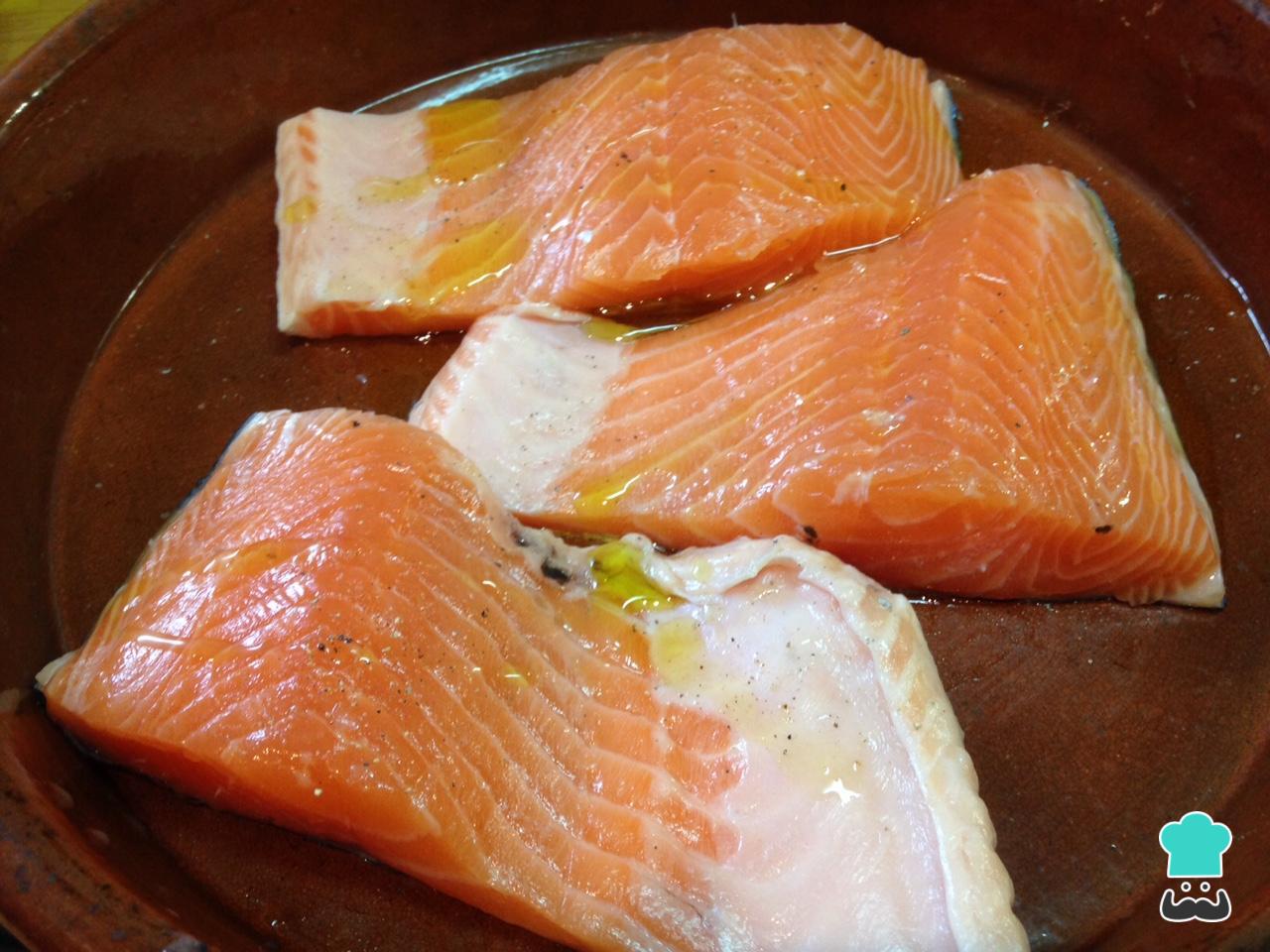 Banhe o fundo de uma assadeira de forno com um pouco de azeite e disponha os filetes de salmão, tempere-os e polvilhe com mais um pouco de azeite.