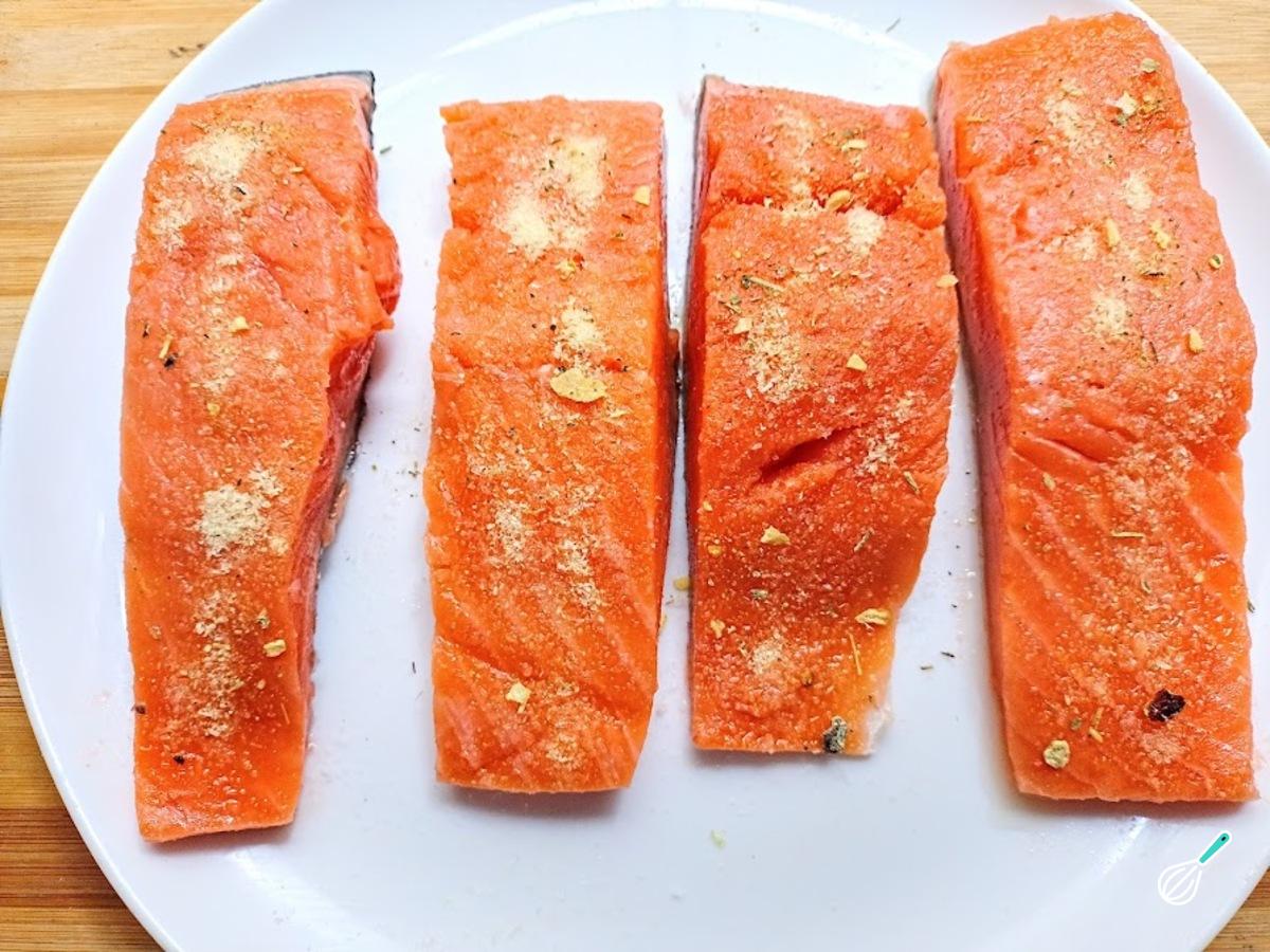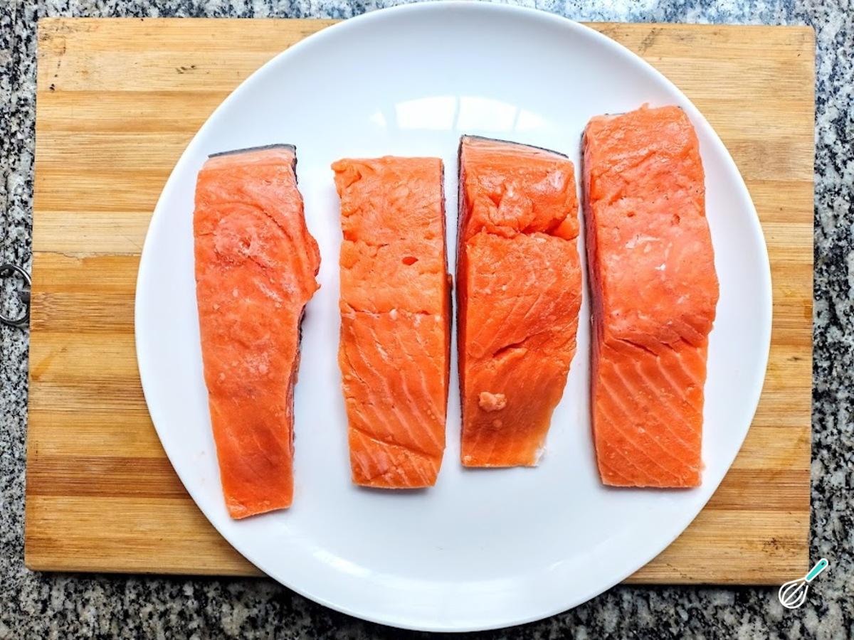 Separar os filés de salmão frescos. Se estiver congelados, devem ser descongelados, conforme instrução da embalagem.