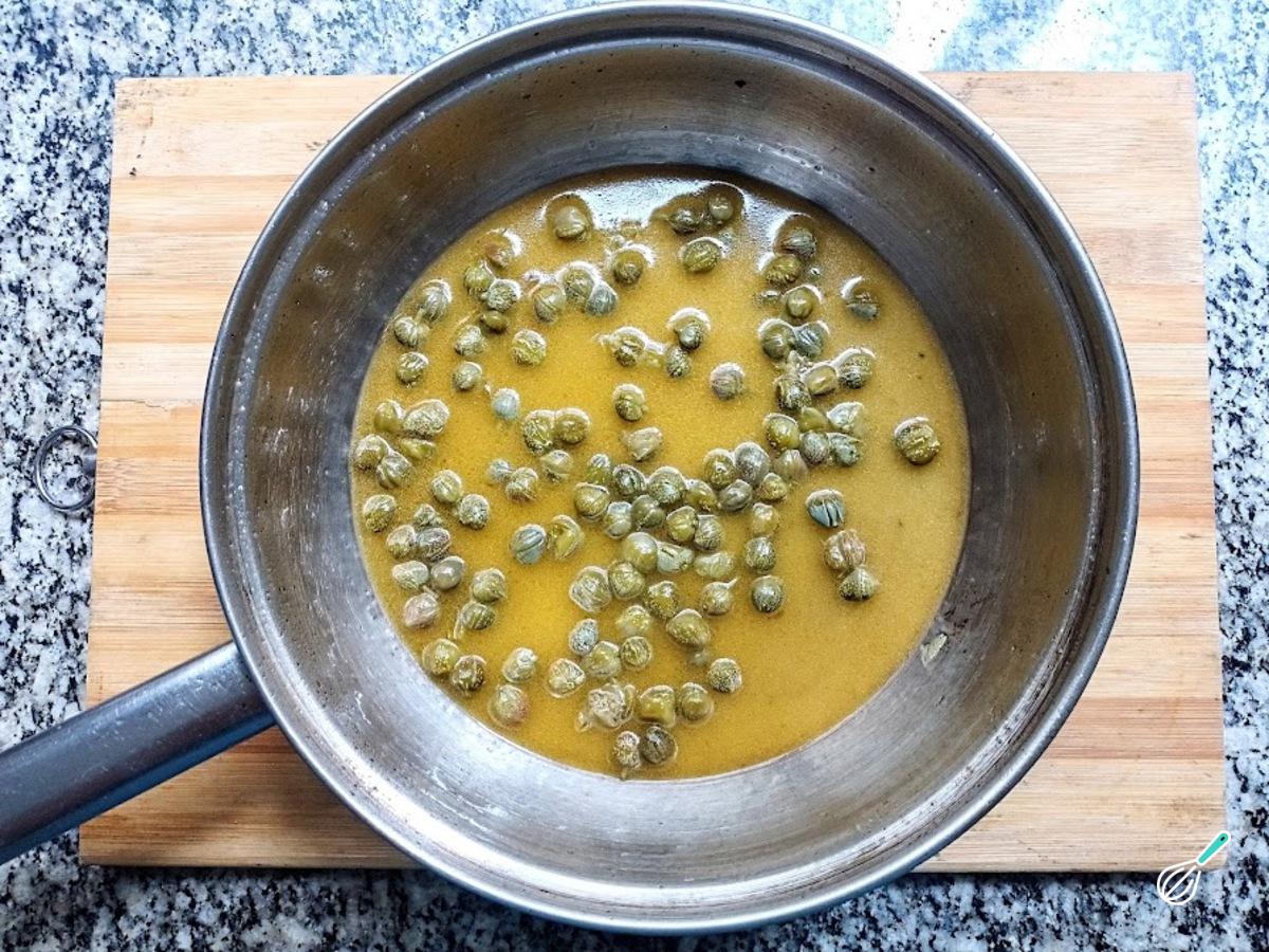 Na mesma frigideira que foi utilizada para fritar os filés, o será preparado molho de alcaparras com manteiga. Tirar o excesso de azeite da fritura.