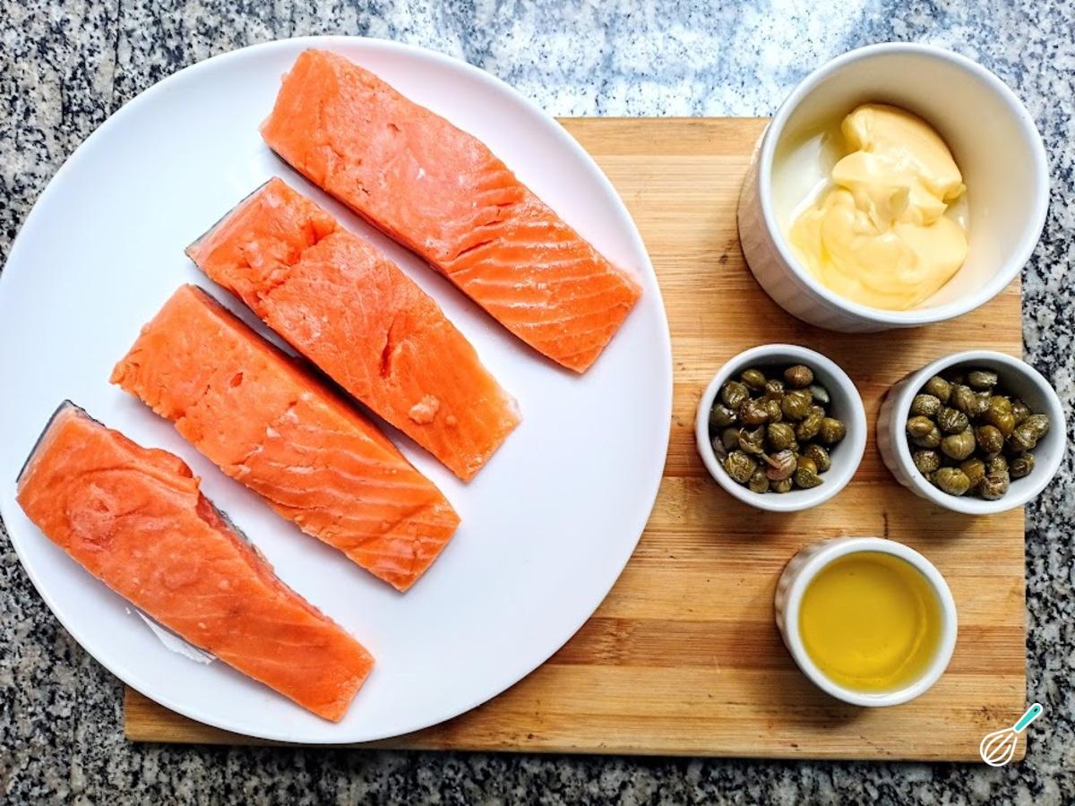 Separe todos os ingredientes, para uma melhor organização da receita de salmão com alcaparras na frigideira.