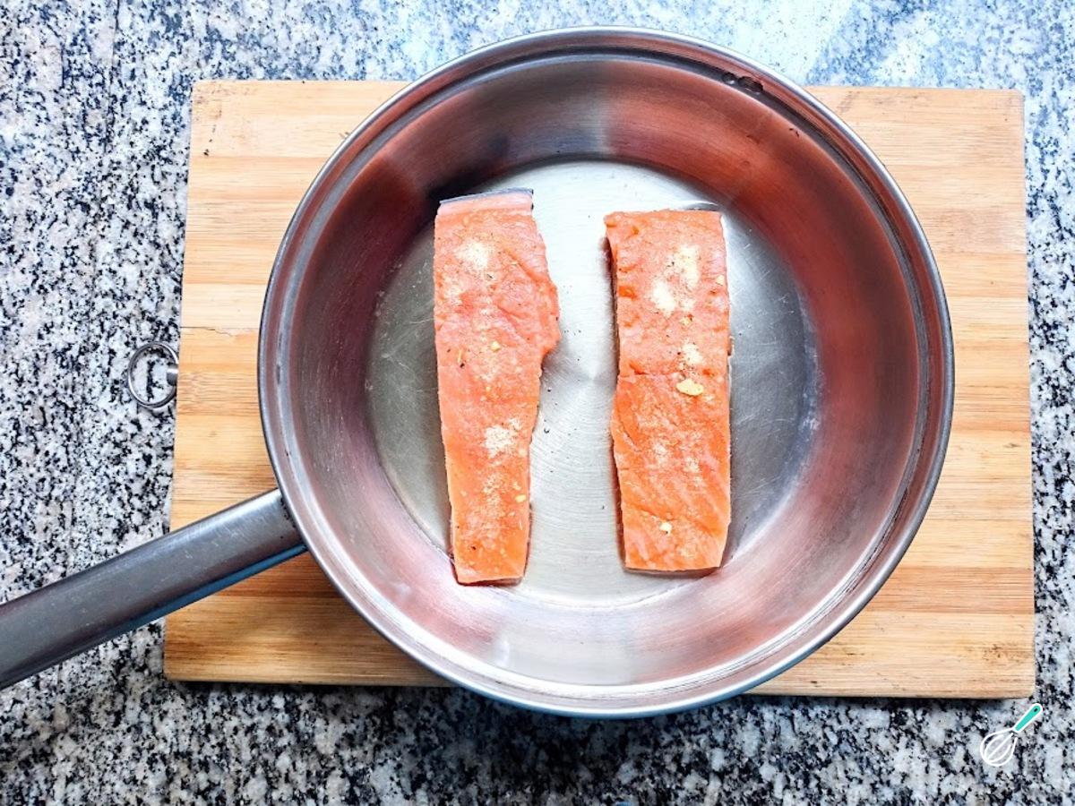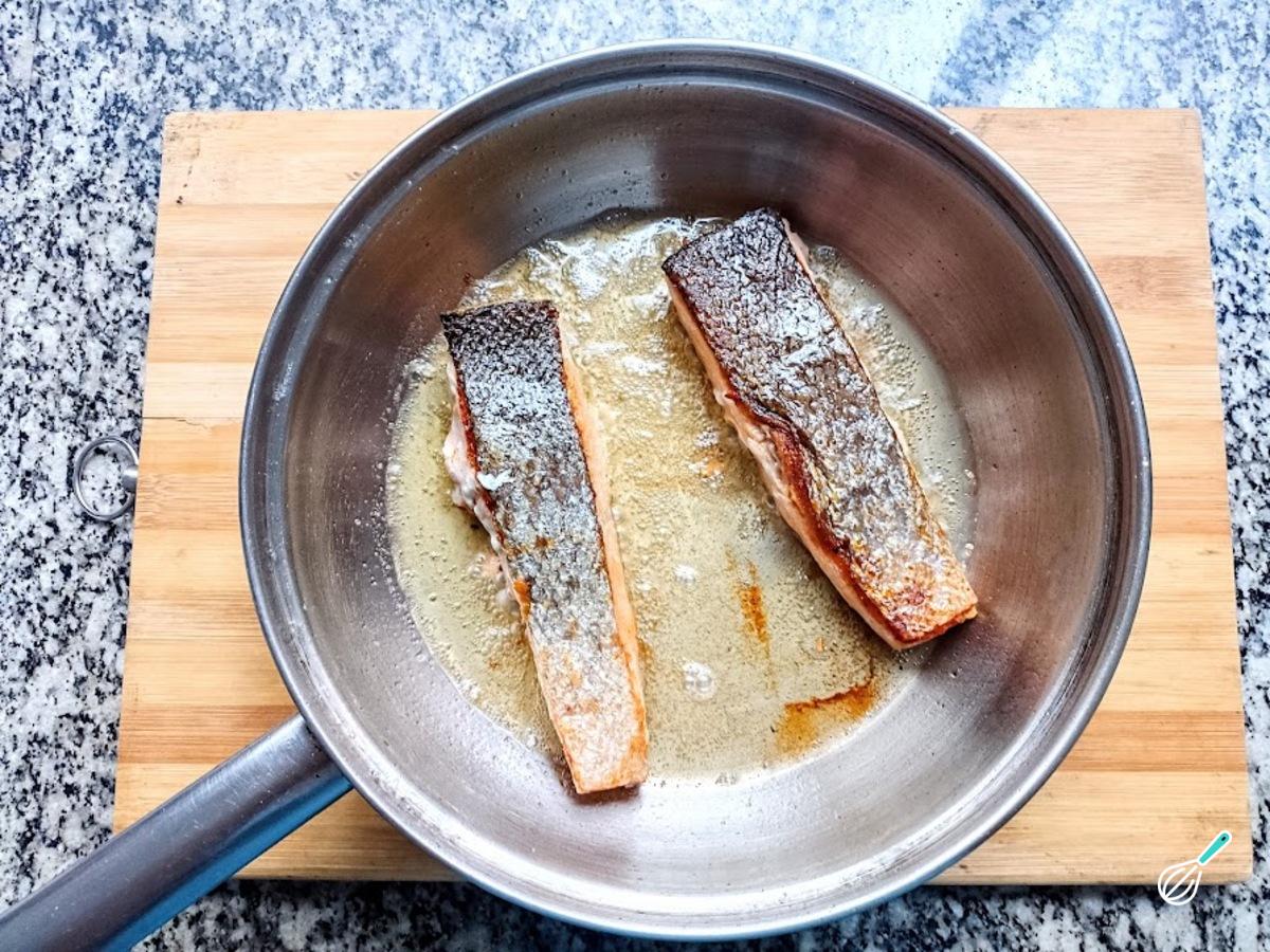 Após 04 minutos, virar os filés cuidadosamente, pois o salmão é um peixe muito sensível e pode desmanchar durante esse processo. Ideal fritar 02 por cada vez.