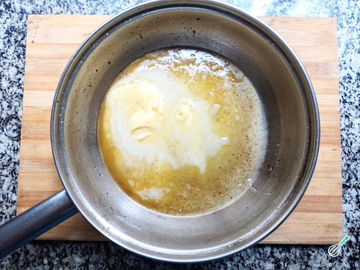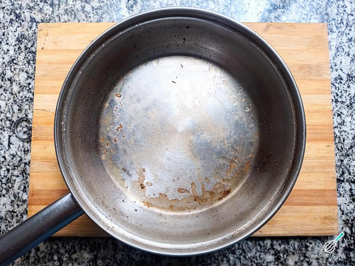 Levar ao fogo e adicionar a manteiga. Fazer a declaçagem (limpar o fundo da frigideira) com a manteiga.