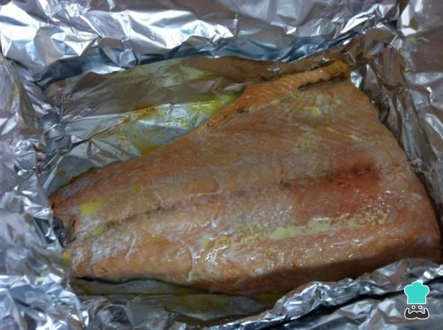 Coloque o salmão embrulhado em um refratário e leve ao forno, preaquecido a 200ºC, por 20-25 minutos.