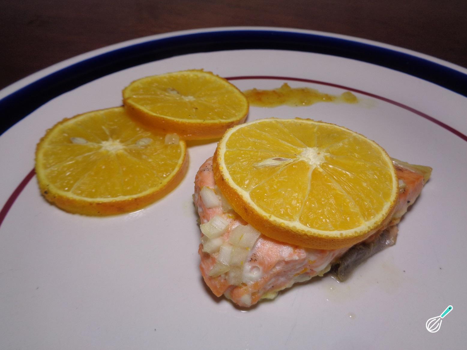 Regue o salmão com essa mistura e, em seguida, corte a laranja restante em fatias. Coloque as fatias sobre o peixe e leve ao forno preaquecido a 190 ° C por 15-20 minutos.