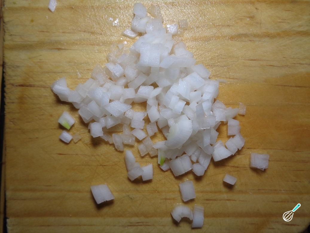 Separadamente, pique a cebola finamente. Se você gosta de sentir a textura da cebola, pode cortá-la em juliana fina, embora eu tenha preferido picá-la (cortar em brunoise).