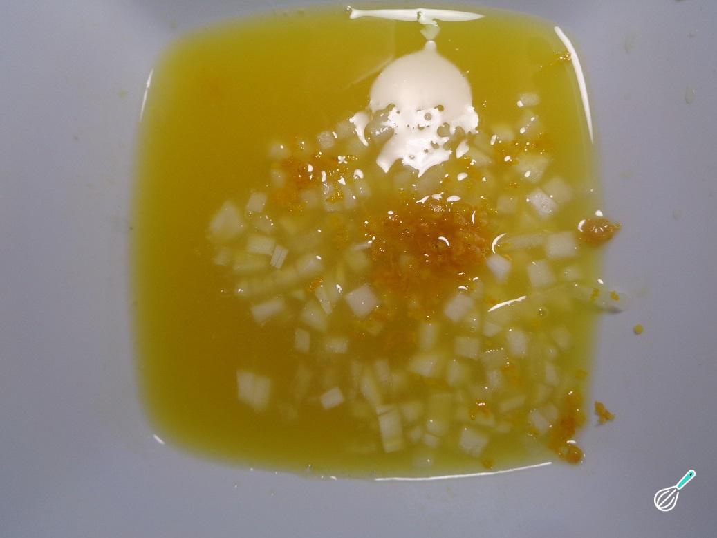 Coloque a cebola em uma tigela. Adicione o suco de laranja, o mel e as raspas de laranja e misture perfeitamente.