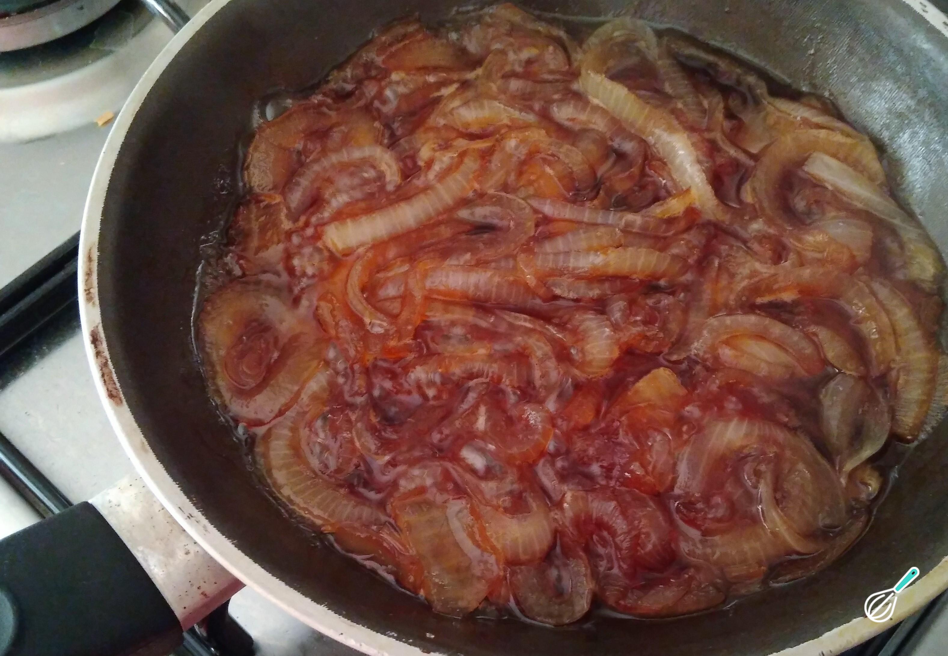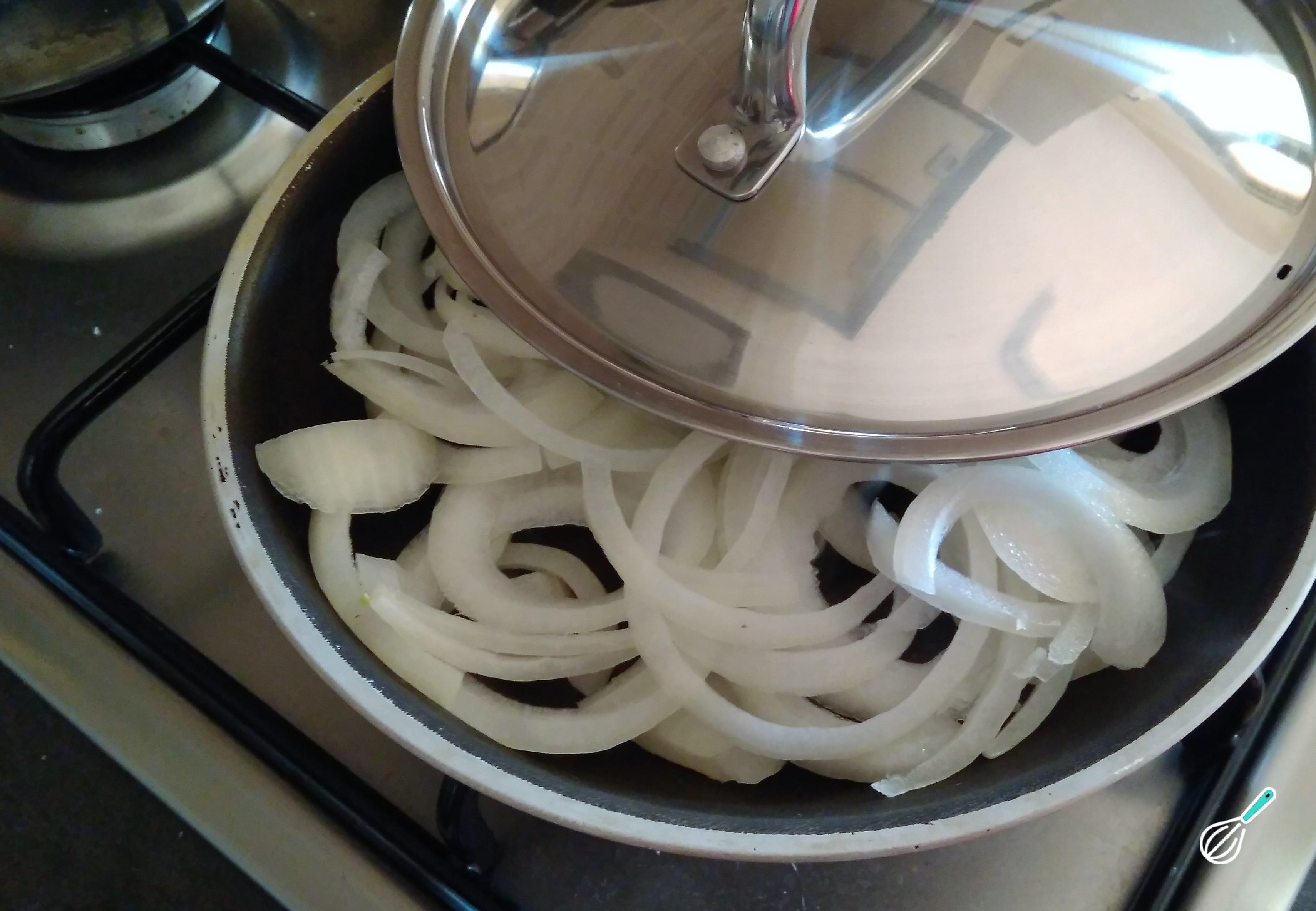 Para fazer a cebola caramelizada, coloque as rodelas em uma frigideira e cozinhe em fogo médio-baixo, com a panela coberta, até mudar de cor e se tornar transparente.