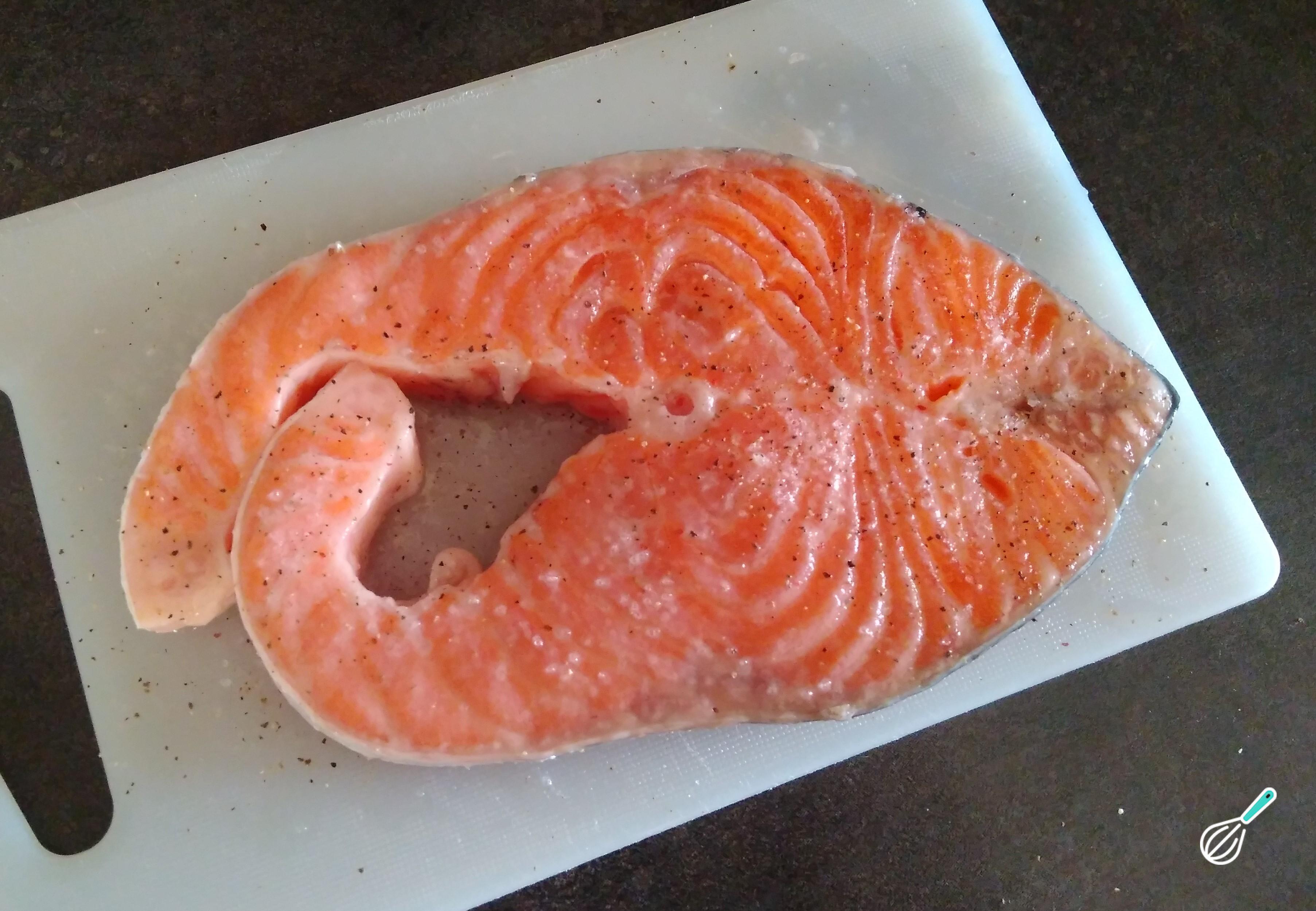 Em seguida, é hora de preparar o salmão. Tempere o peixe com sal, pimenta do reino e suco de limão.