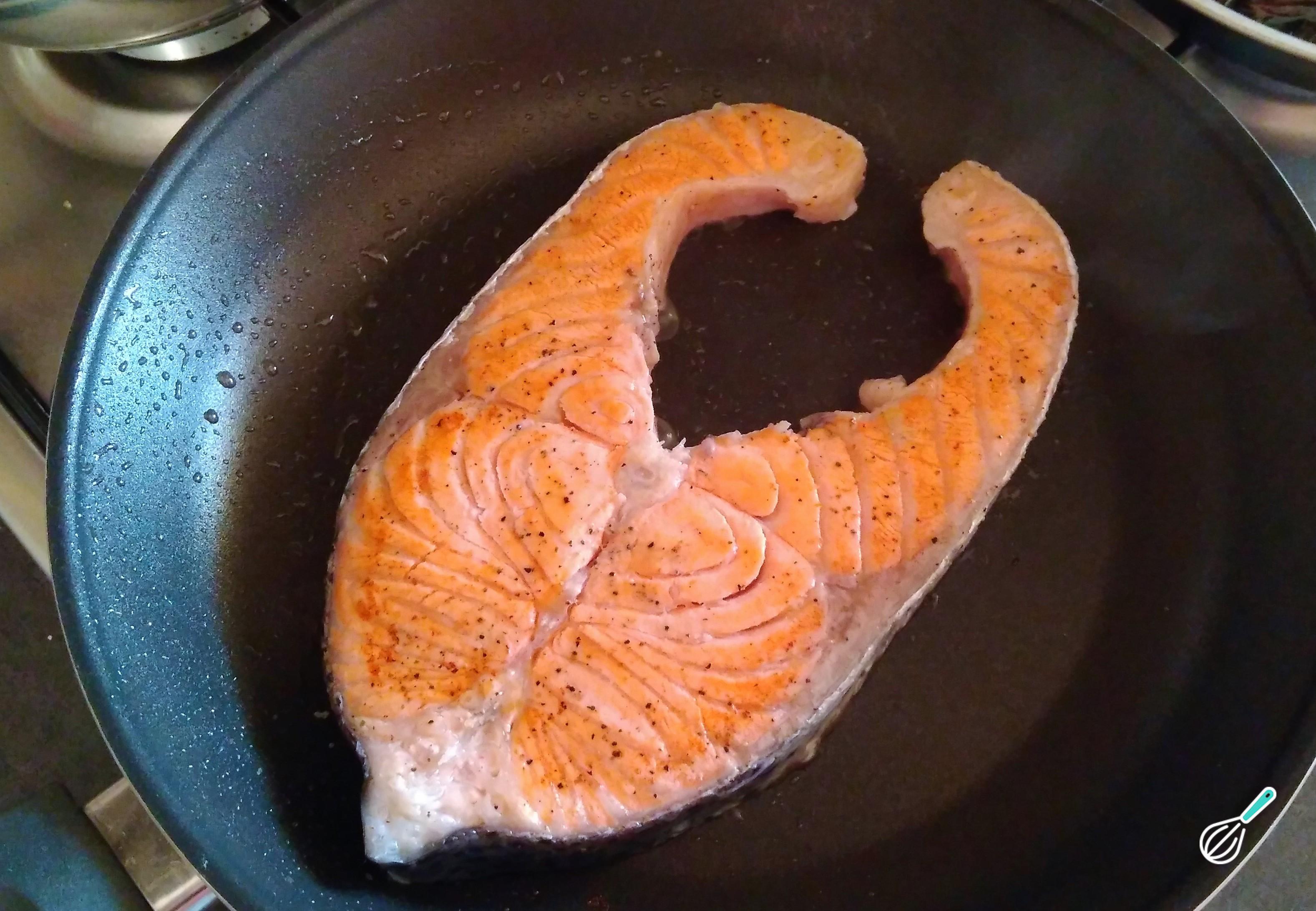 Cozinhe o salmão na frigideira sem óleo, você verá como o peixe libera o seu próprio óleo. Deixe dourar as laterais por 2-3 minutos, o peixe cozinha muito rápido. Se você gostar do peixe bem passado, pode deixar cozinhar por alguns minutos.