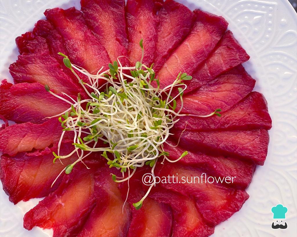 Sirva o gravlax de salmão com beterraba num prato bem bonito e decore com algumas folhas - gosto de colocar broto de alfafa, acho que o picante dele combina muito bem com esse carpaccio de salmão curtido na beterraba. Prove e diga nos comentários o que você achou. Bom apetite!