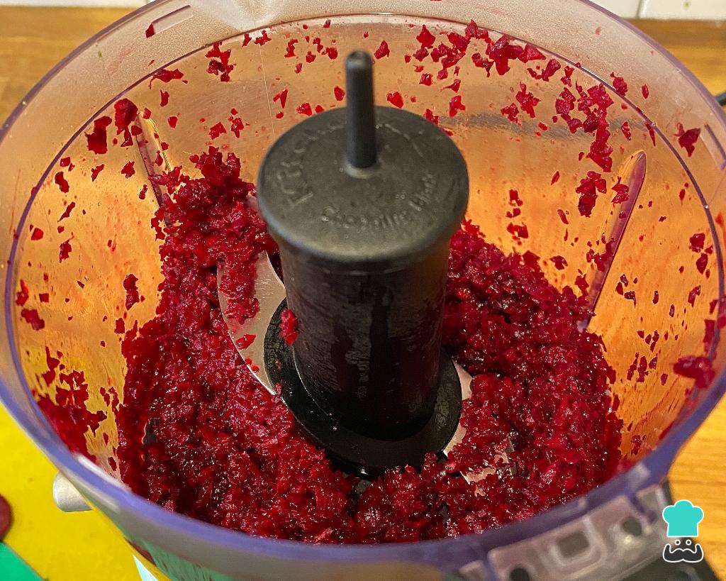 Comece seu carpaccio de salmão marinado na beterraba processando a beterraba junto com as raspas da casca do limão, até formar uma pasta. Se precisar, pode acrescentar um pouco de água para ajudar a bater (usei 2 colheres de sopa de água).