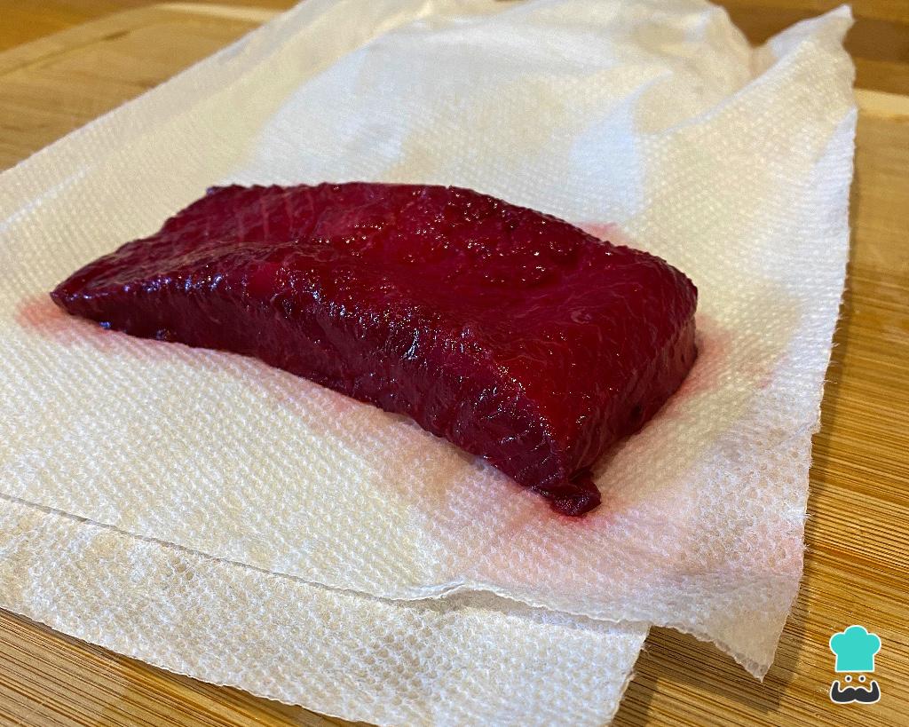 Passado o tempo retire o salmão do saquinho e lave-o rapidamente sob água corrente. Depois seque bem usando um papel toalha.