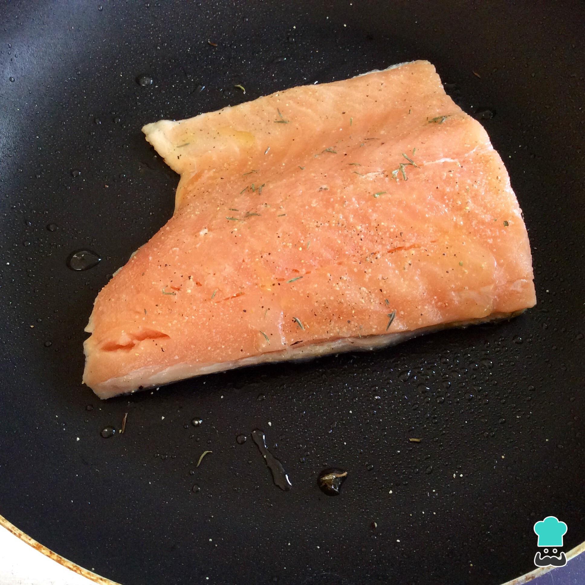Tempere o salmão com sal, pimenta e, se quiser, um pouco de ervas aromáticas. Leve ao fogo médio numa grelha ou frigideira com um pouco de azeite, para não grudar, cozinhe por 4 minutos, baixe o fogo e cozinhe tampado por mais 4 minutos.