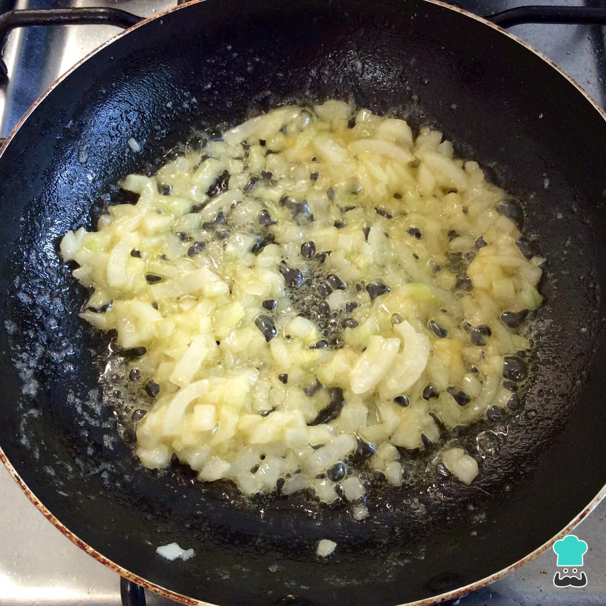 Para fazer o molho de queijo para o salmão, leve ao fogo alto uma frigideira com a manteiga e a cebola picada finamente. Cozinhe por 3 minutos, ou até a cebola ficar transparente.