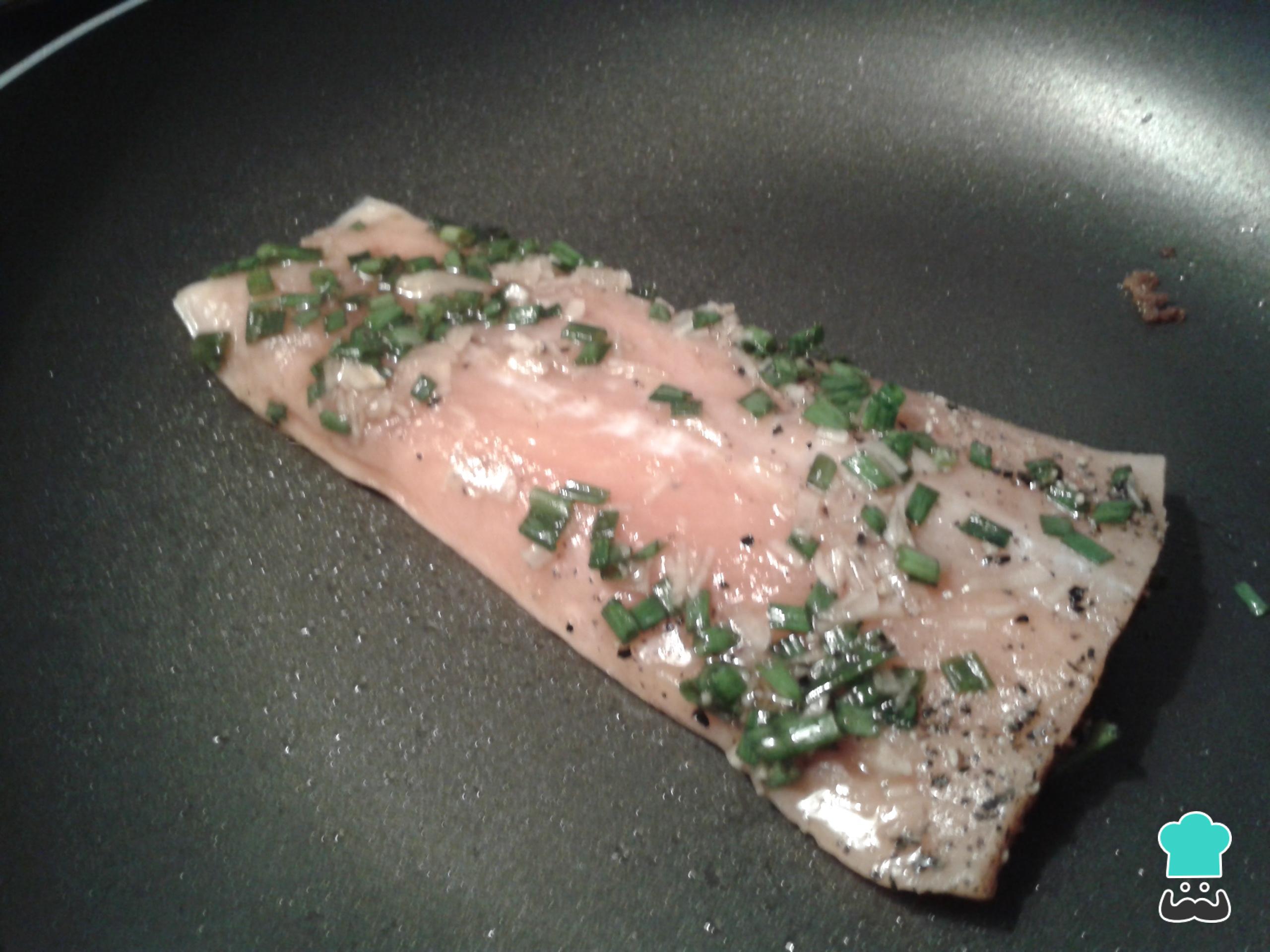 Cozinhe o salmão por 7-8 minutos de cada lado, ou menos, se observar que ele está ficando seco. Quando estiver pronto, retire e sirva decorado com cebolinha fresca. Não deixe de experimentar estar receita de salmão grelhado na frigideira e dizer-nos o que achou! Bom apetite!