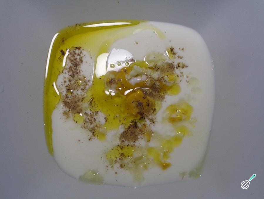 Prepare agora para preparar o molho de iogurte, para isso misture o iogurte grego com a mostarda, o alho picado, o azeite, o suco de limão e uma pitada de pimenta do reino. Misture tudo muito bem, até todos os ingredientes estarem bem integrados.