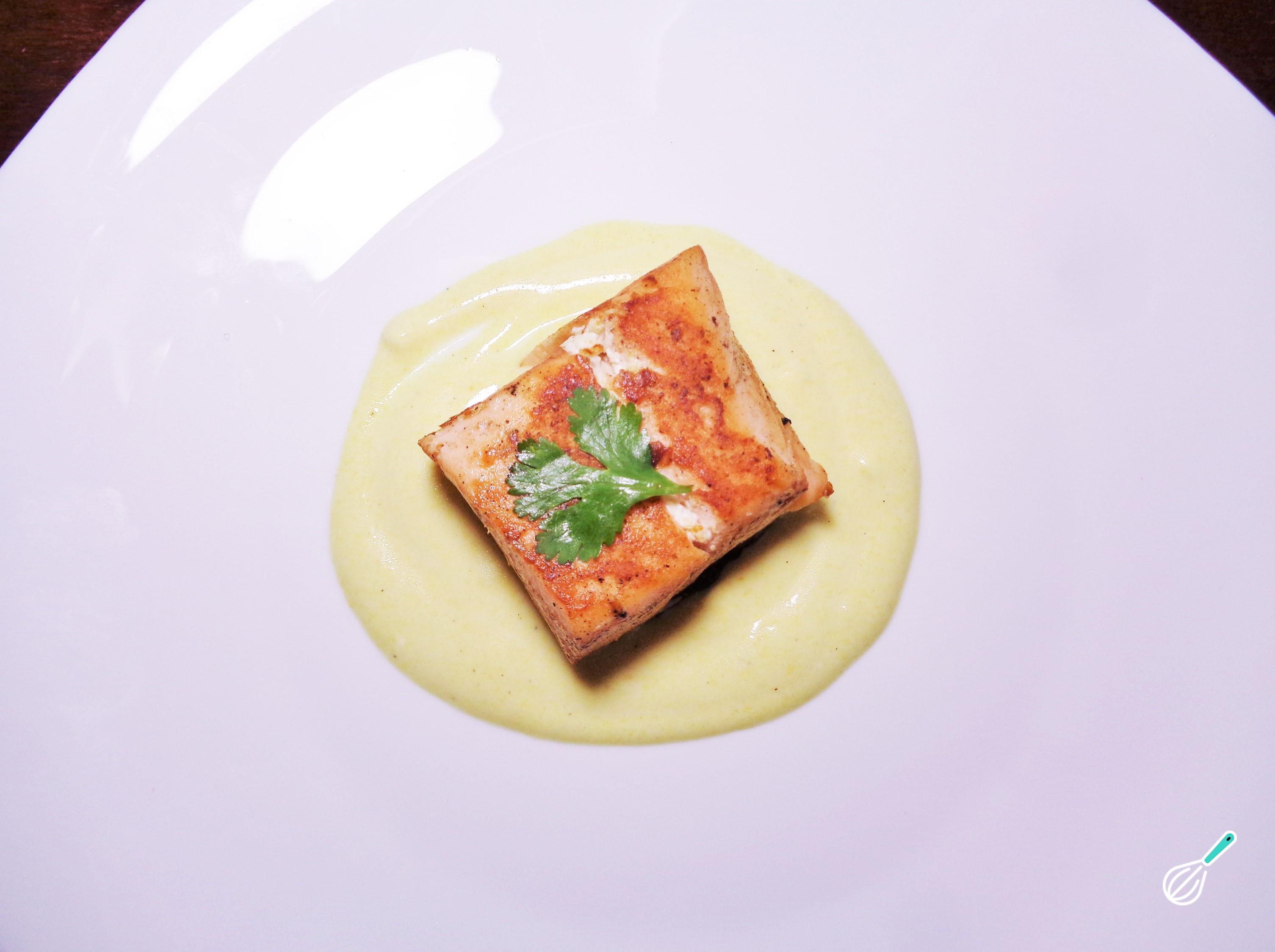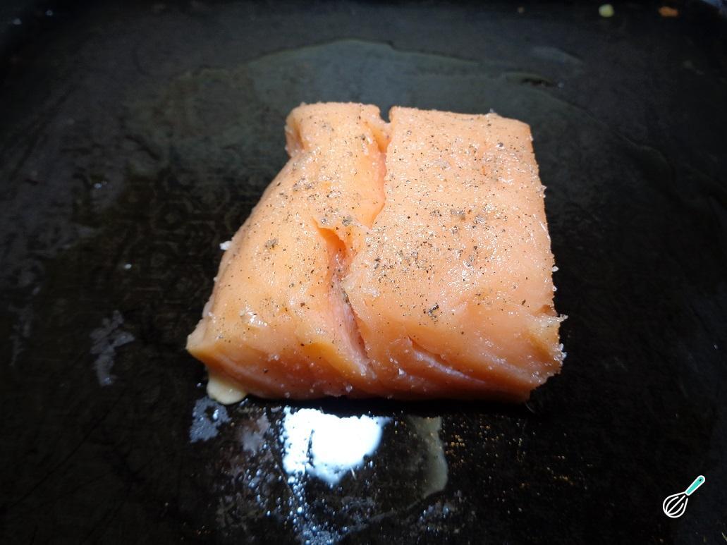 Enquanto o molho repousa, tempere o lombo de salmão com sal, pimenta do reino e leve a cozinhar na prancha quente. Deixe que cozinhe por três minutos de cada lado.
