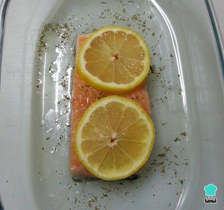 Em seguida, corte o limão em rodelas e coloque-as sobre o salmão. Tente que as rodelas sejam mais ou menos grossas, desta forma vão dar muito mais sabor ao salmão enquanto estiver no forno.