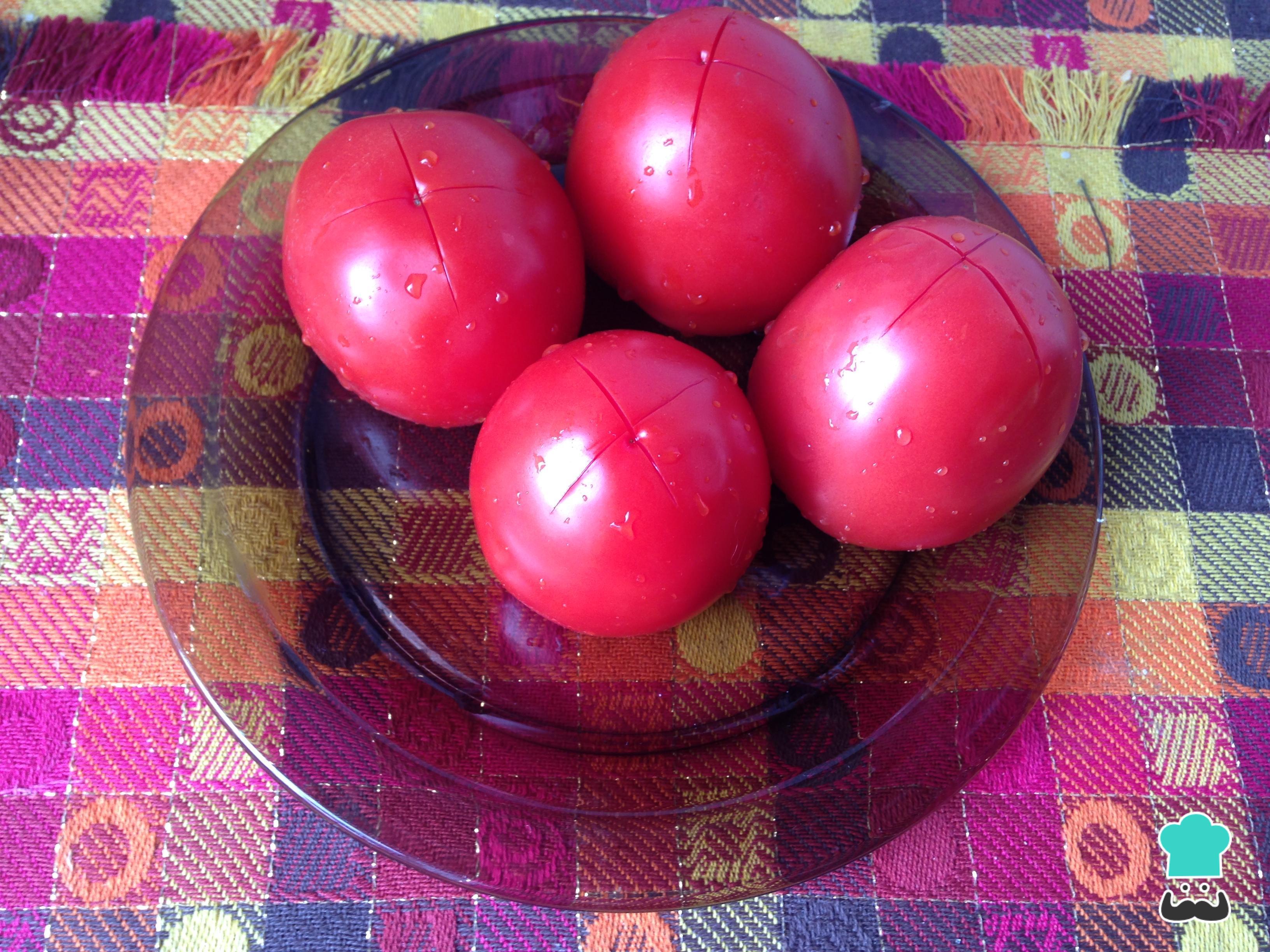 Lave os tomates e, com ma faca, faça uma cruz neles.