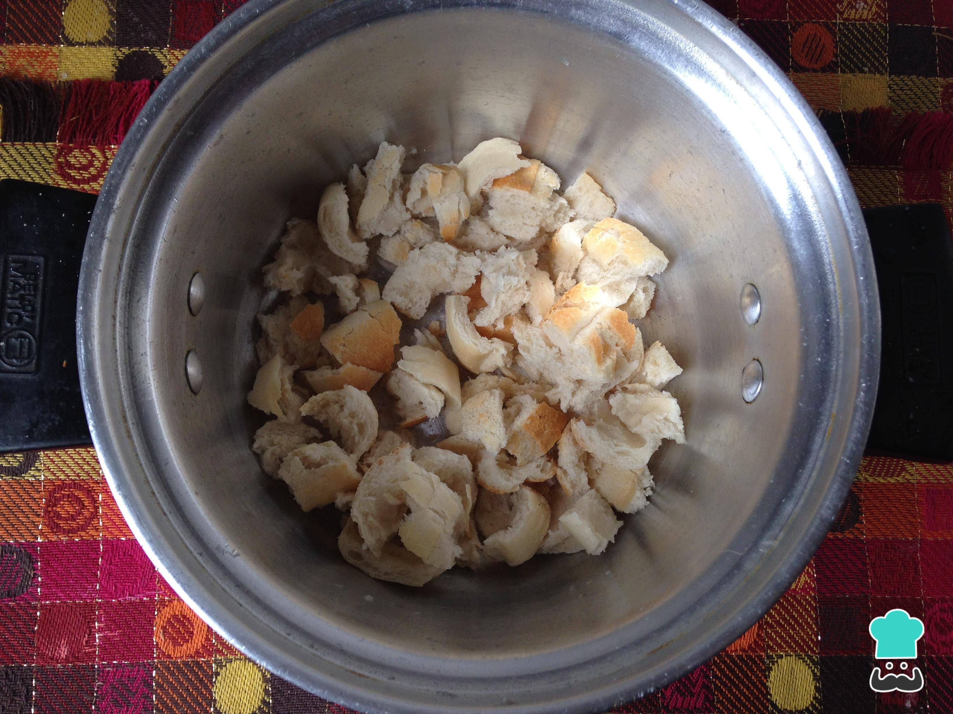 Parta o pão em pedaços muito pequenos e reserve numa panela.
