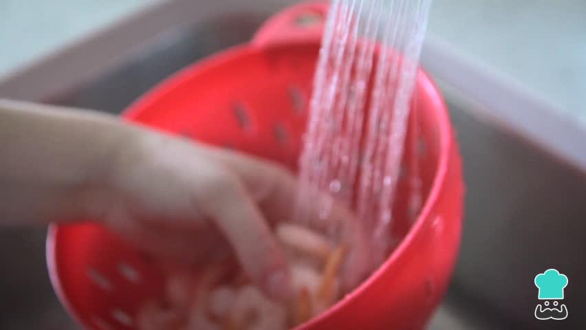 Para preparar um salpicão de camarão delicioso, comece por lavar o filé de camarão no escorredor. Deixe escorrer a água e, se necessário, coloque o camarão sobre um pano para secar bem. Lave e rale as cenouras e reserve.