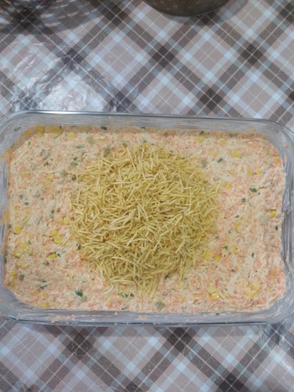 Em um recipiente grande, misture a cenoura, a uva passa, a maionese, o creme de leite, a salsinha, o milho, a cebolinha e a azeitona. Junte o frango desfiado, mexa bem e cubra com batata palha.