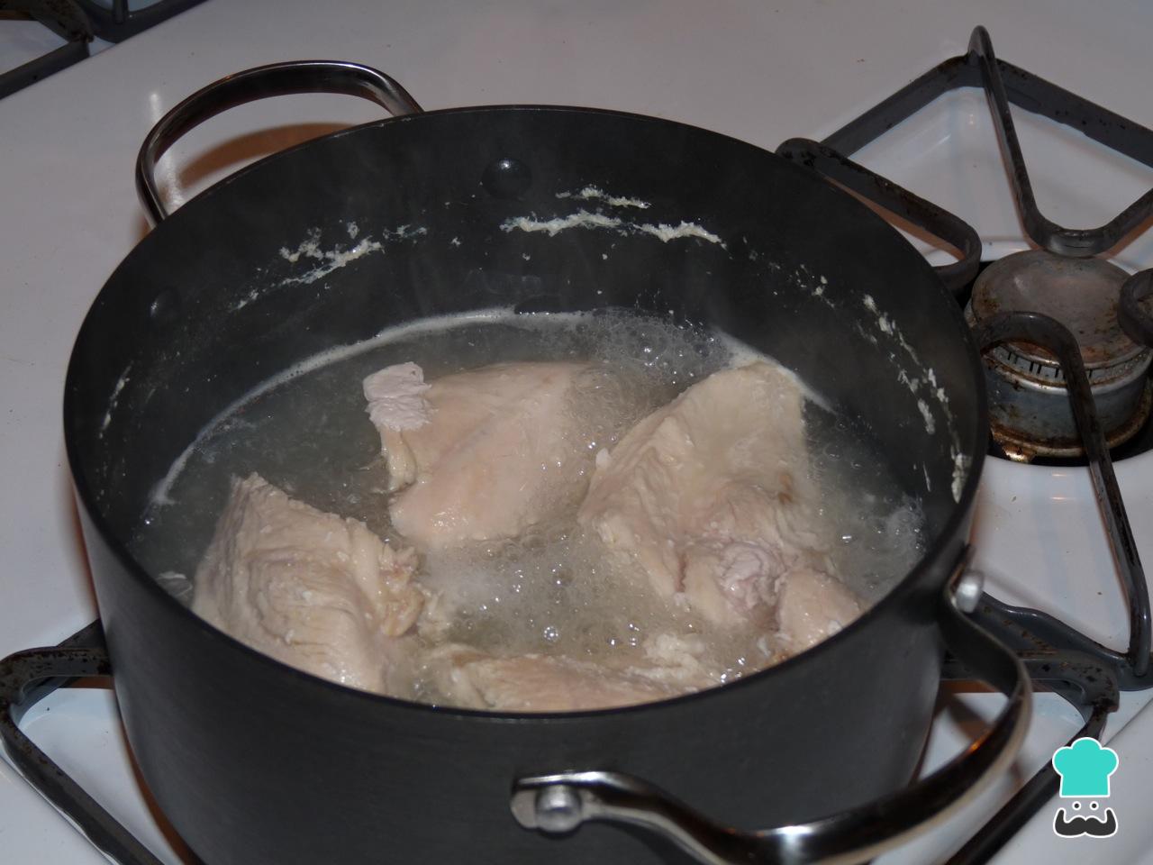 Para fazer salpicão de frango com creme de leite, comece por cozinhar peito de frango junto com o alho. Desfie e reserve.