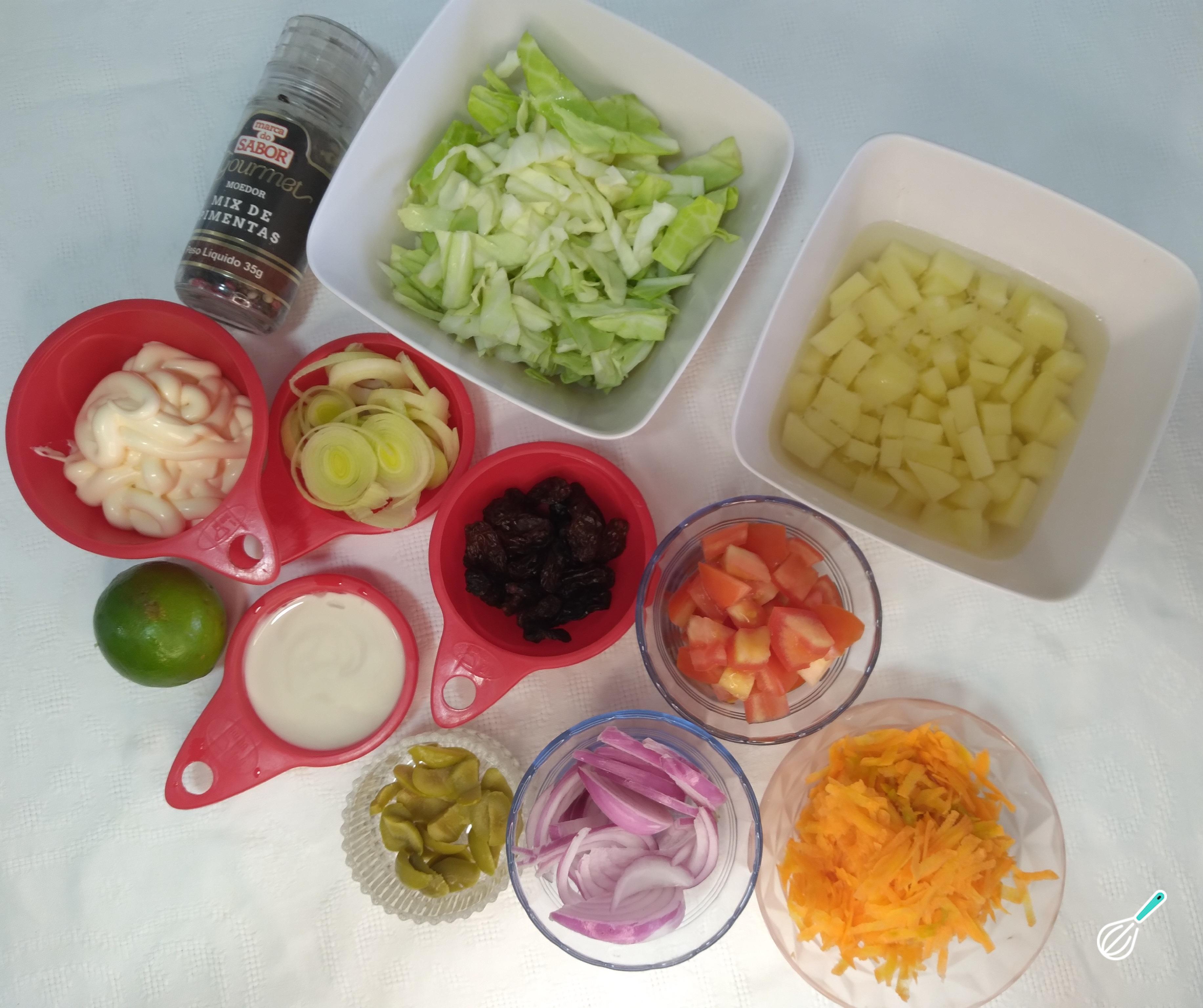 Comece separando todos os ingredientes para o preparo do salpicão de legumes. Corte a batata inglesa em cubinhos pequenos. Rale a cenoura, o alho-poró, corte em rodelas finas. A cebola em corte em meia lua (formato julienne). Corte as azeitonas em pedaços pequenos, assim como o tomate. Corte o repolho e tiras finas.