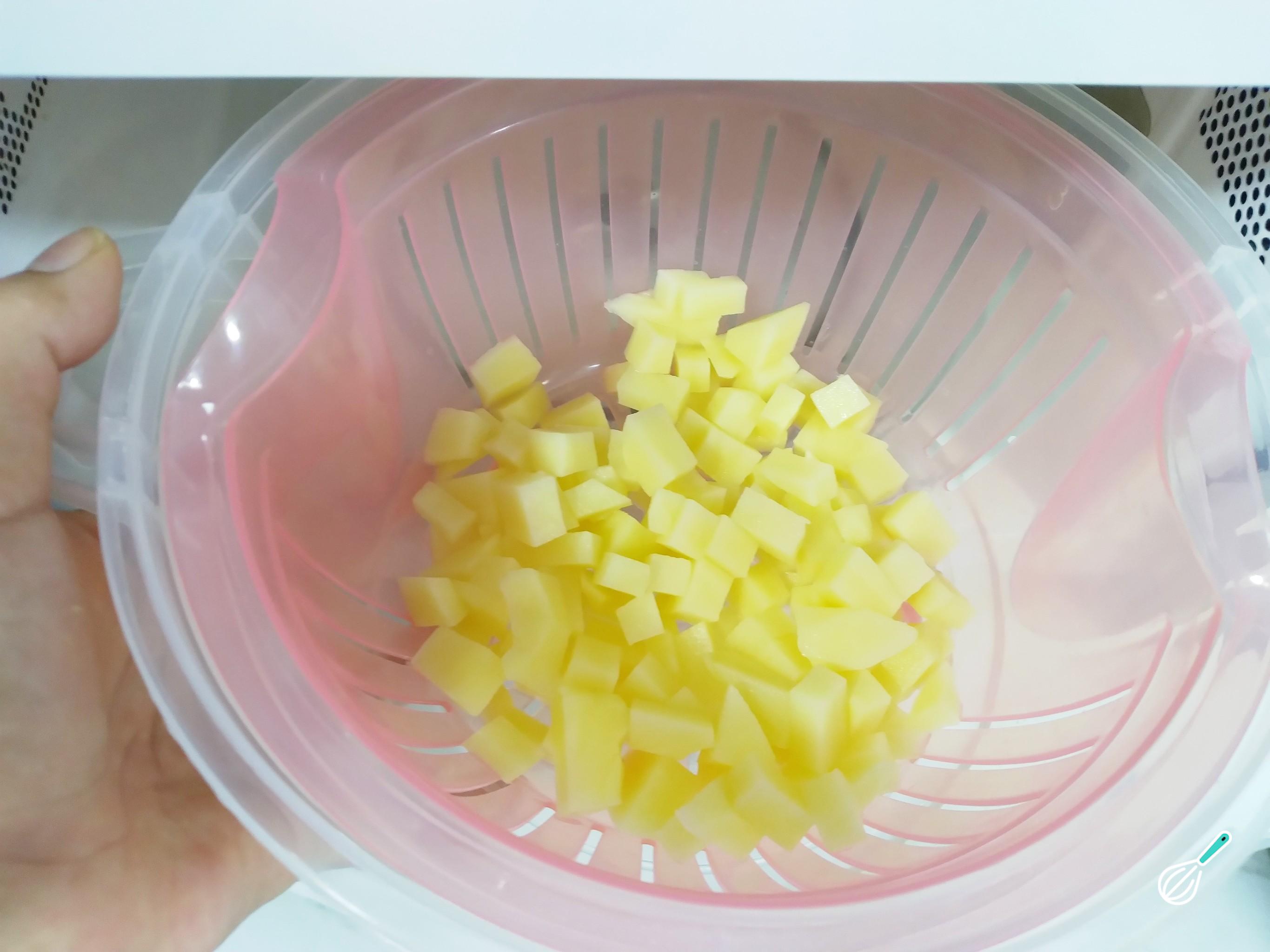 Coloque a batata inglesa cortada para cozinhar na panela para micro-ondas. Deixe cozinhar por 6 minutos. Divida o tempo entre 3 e 3 minutos. Esse processo também pode ser realizado no fogão em panela convencional ou no vapor.