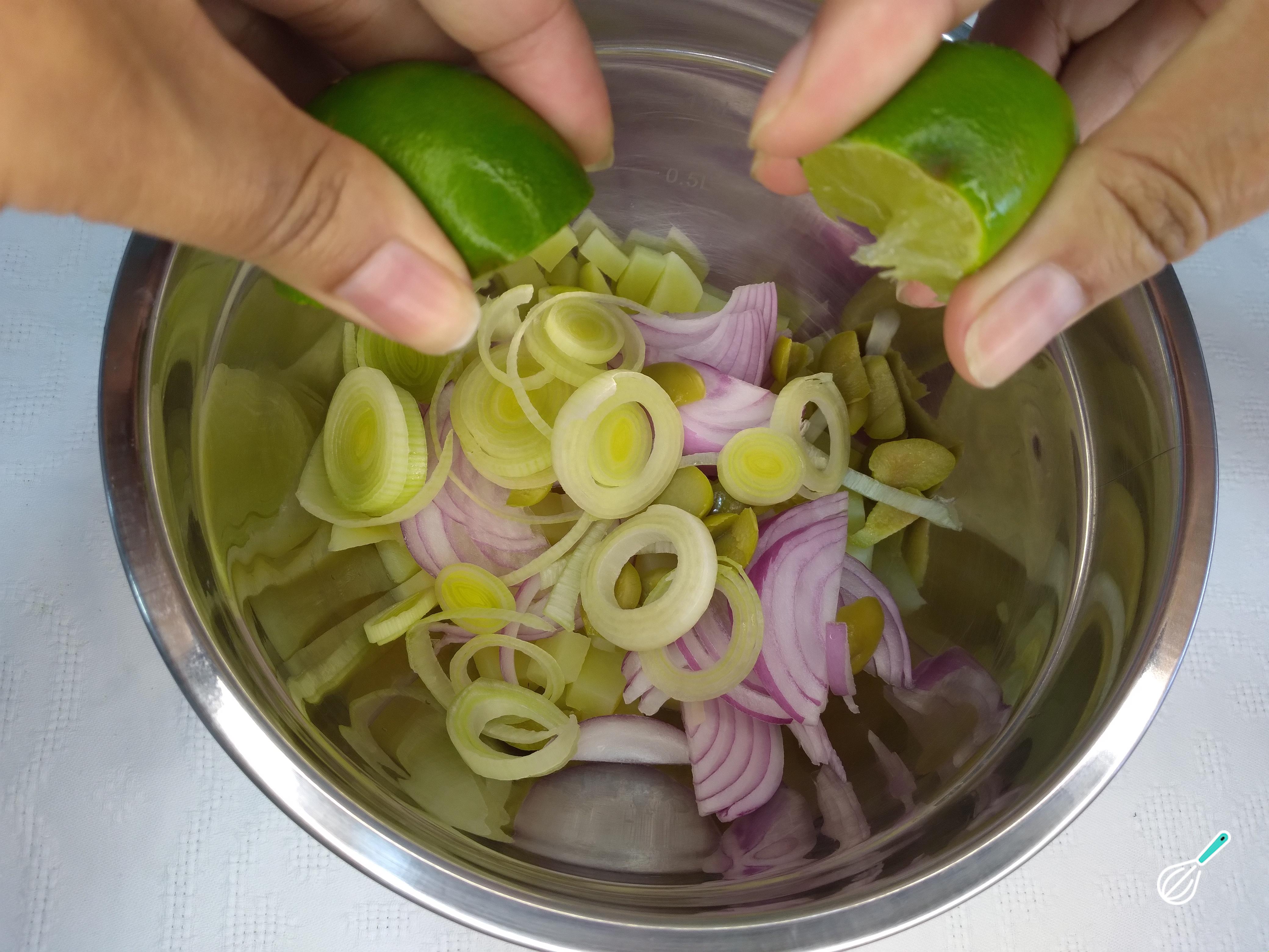 Dica: Misture primeiro esses ingredientes para que o limão quebre a acidez da cebola. O aconselhável é usar nessa receita a cebola roxa por ter um sabor mais suave.
